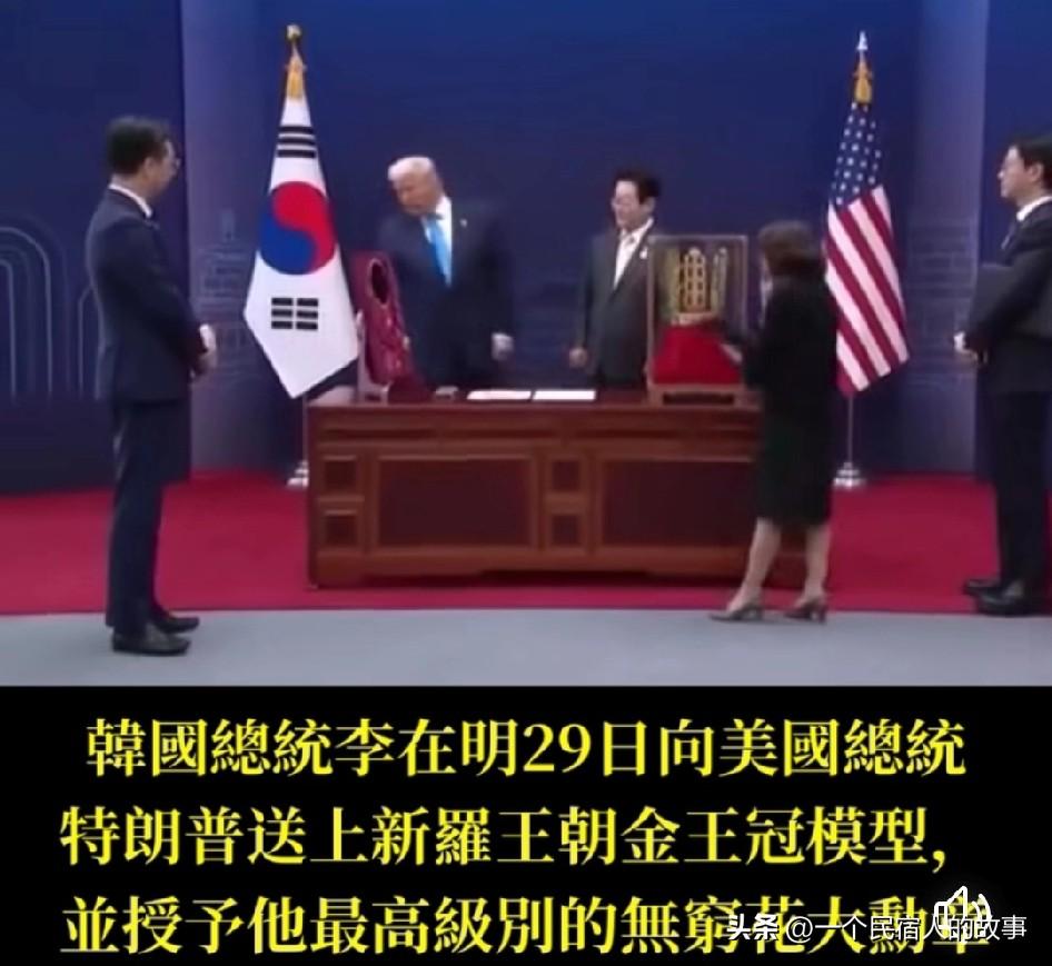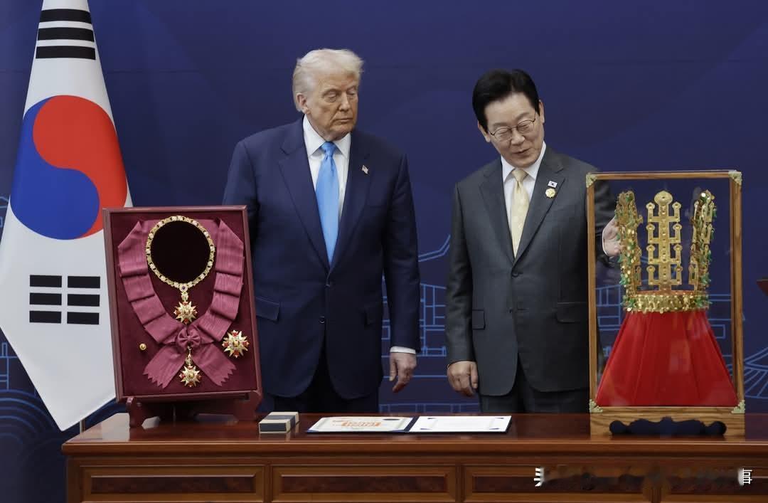 川普接受李在明送礼认真查看 川老头真吃奉承送礼这一套啊 最近亚洲外交活动可谓是精彩纷呈啊,几乎世界的注意力都在这边了,欧洲和乌克兰仿佛被遗忘一般。最大的两场外交活动是马来西亚举办的东盟峰会和韩国举办的APEC,连向来不爱这类活动川普都来了,在日本川普收到了高市早苗送的黄金高尔夫球。 到了韩国李在明又送了新罗王朝黄金王冠的仿制品,川普很开心,当场查看礼物,很吃这一套啊。