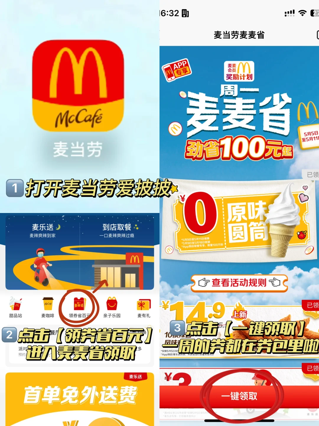 ➡只需要登陆麦当劳爱披披--从首页【领券省百元】进入麦麦省-点击【一键领取】