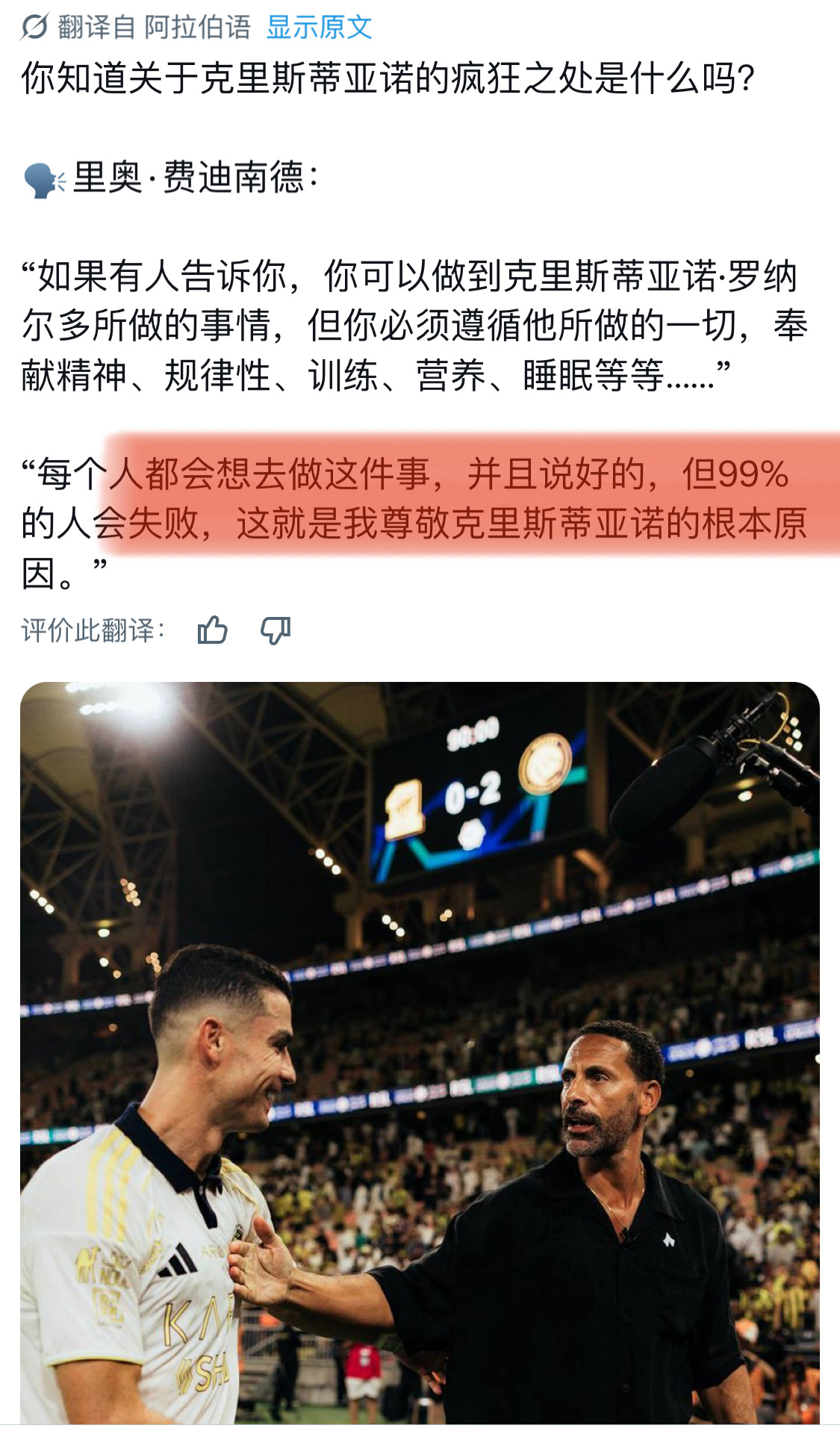 “每个人都会想去做这件事,并且说好的,但99%的人会失败,这就是我尊敬克里斯蒂亚诺的根本原因。”