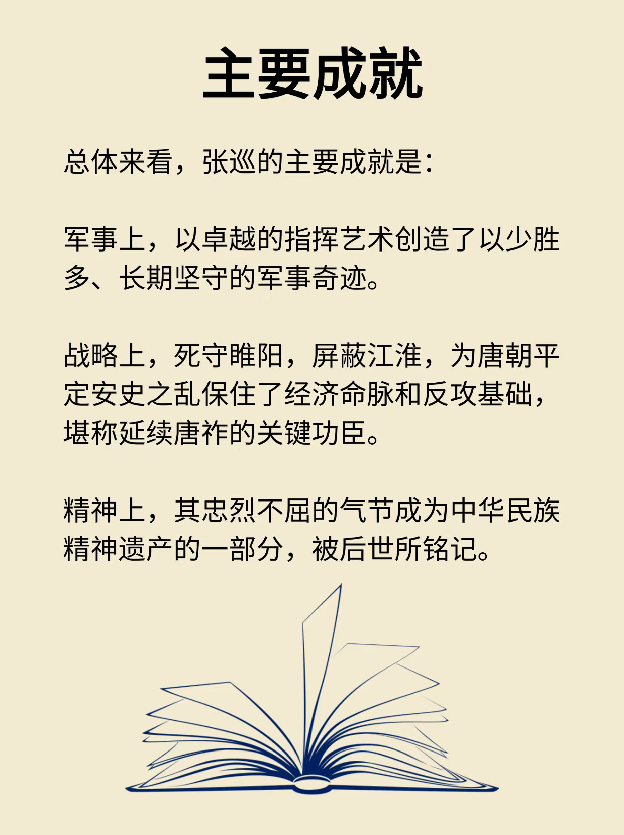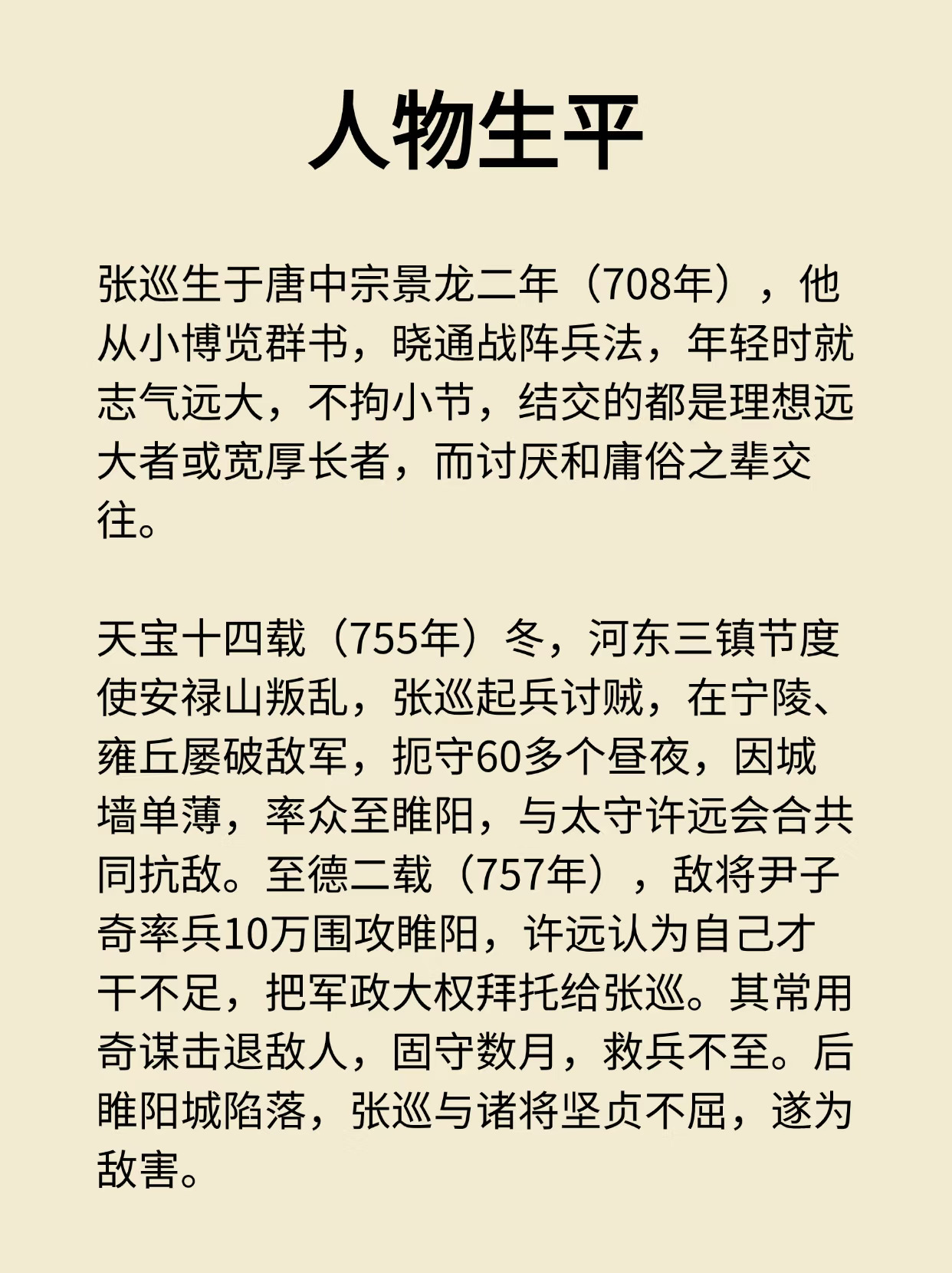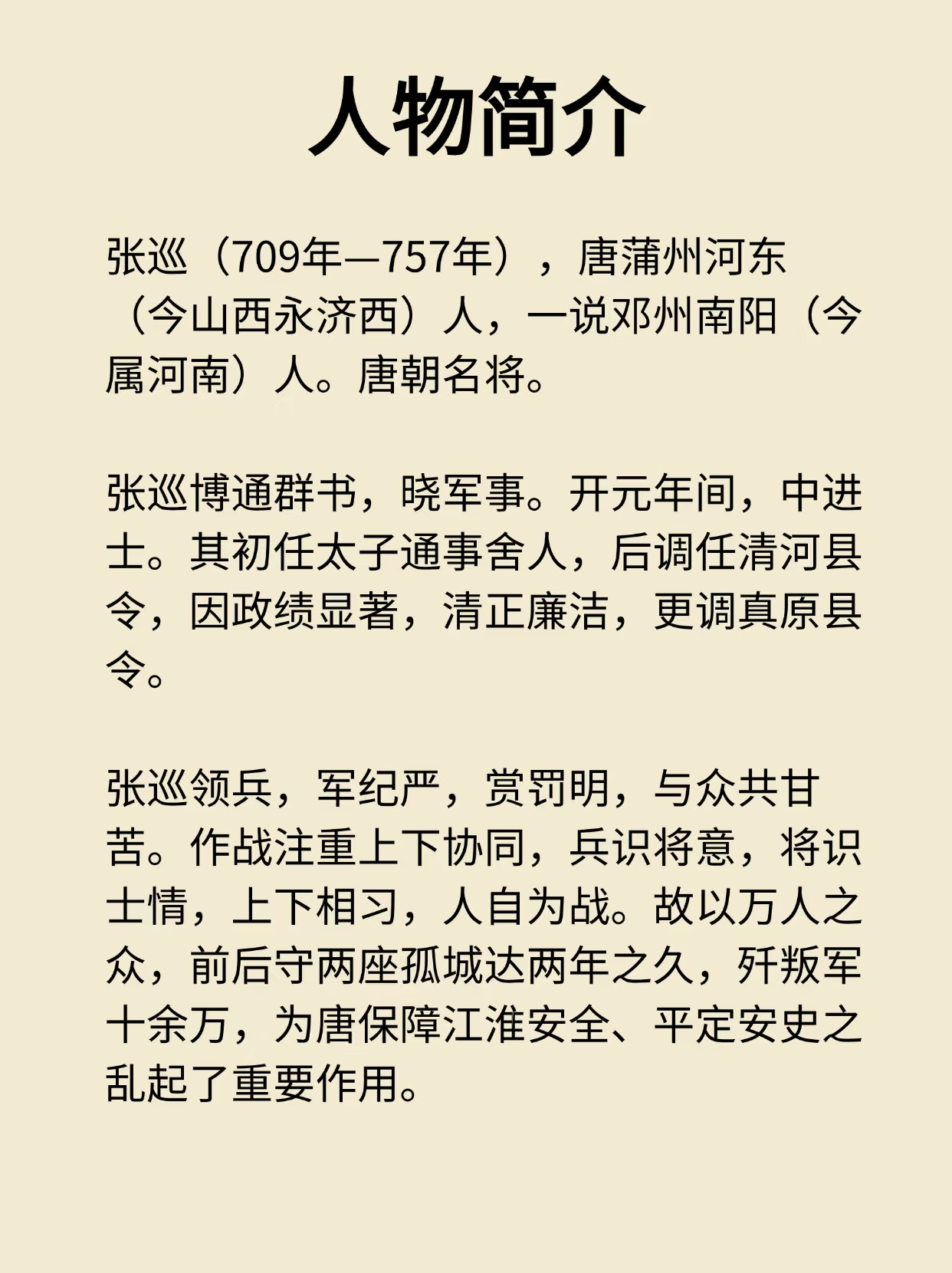 [拔草R]张巡领兵,军纪严,赏罚明,与众共甘苦。作战注重上下协同,兵识将意,将识士情,上下相习,人自为战。故以万人之众,前后守两座孤城达两年之久,歼叛军十余万,为唐保障江淮安全、平定安史之乱起了重要作用。