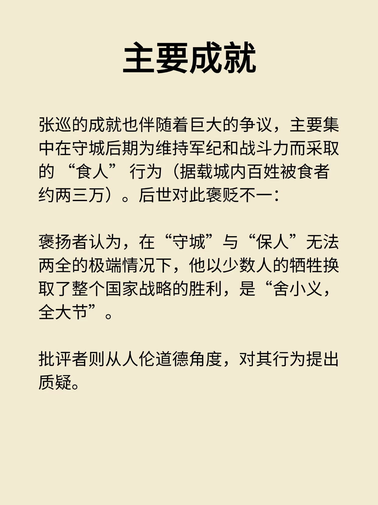 [星R]张巡的成就也伴随着巨大的争议,主要集中在守城后期为维持军纪和战斗力而采取的“食人”行为(据载城内百姓被食者约两三万)。