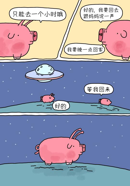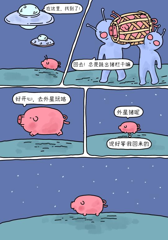曾经约好的轰轰烈烈,曾经一起说看尽人间烟火,曾经说好多年以后的再聚……是的,这些都没有实现,仿似也没有实现的可能性了,因为,有些人被外星人抓走了。 猪猪 猪猪 漫画 原创漫画 可爱绘本 一日一画回忆 遗憾 脑洞 你有朋友被外星人抓走吗 [投票]