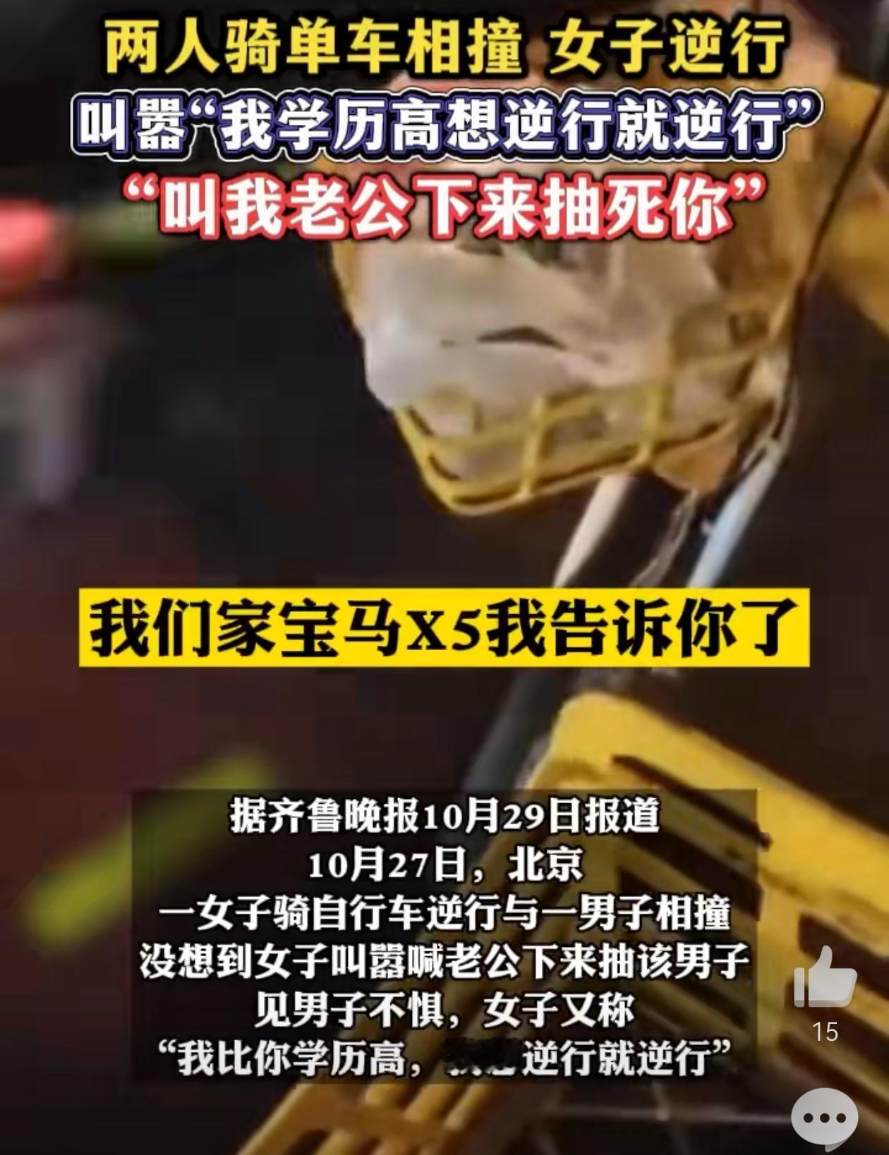 “你是本科吗?你是硕士吗?我上211、985时候,你还穿尿不湿呢!”女子逆行被撞叫嚣我学历高想逆行就逆行,称我学历比你高,还叫嚣喊老公下楼来“抽死你”…宝马X5,高学历,并不能代表马路是你家开的,还是饭吃的太饱了……