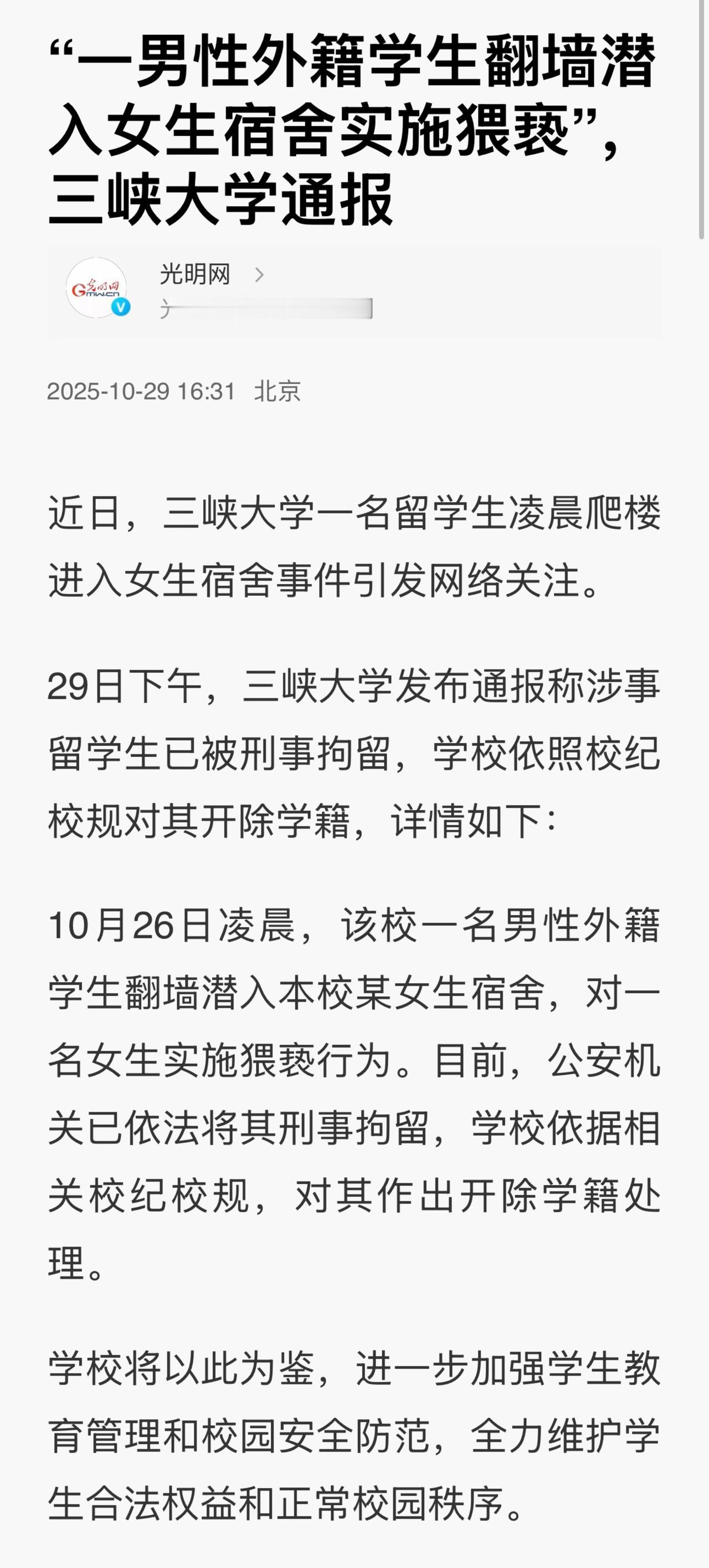 涉事留学生徒手攀爬一楼防盗网进入二楼宿舍,对一名正在休息的女生实施猥亵,遭激烈反抗后逃离现场,受害女生面部受伤。 同楼层学生听到搏斗声后录音并协助报警,宿管人员第一时间封锁现场。