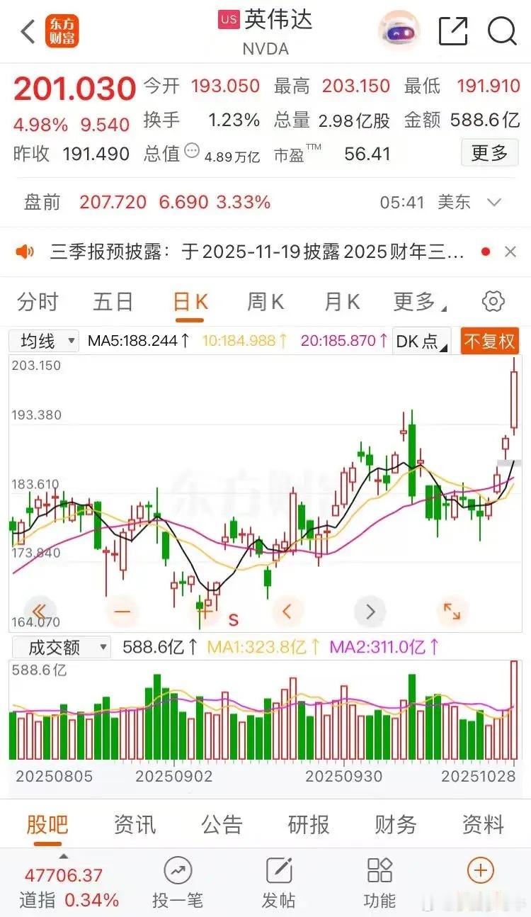英伟达涨幅4.98%,收盘报收201.030美元每股,又又又又又创新高。嗲下去总会又涨上来突破新高,强强强强,这才是遥遥领先。很快总市值要突破5万亿美元市值。
