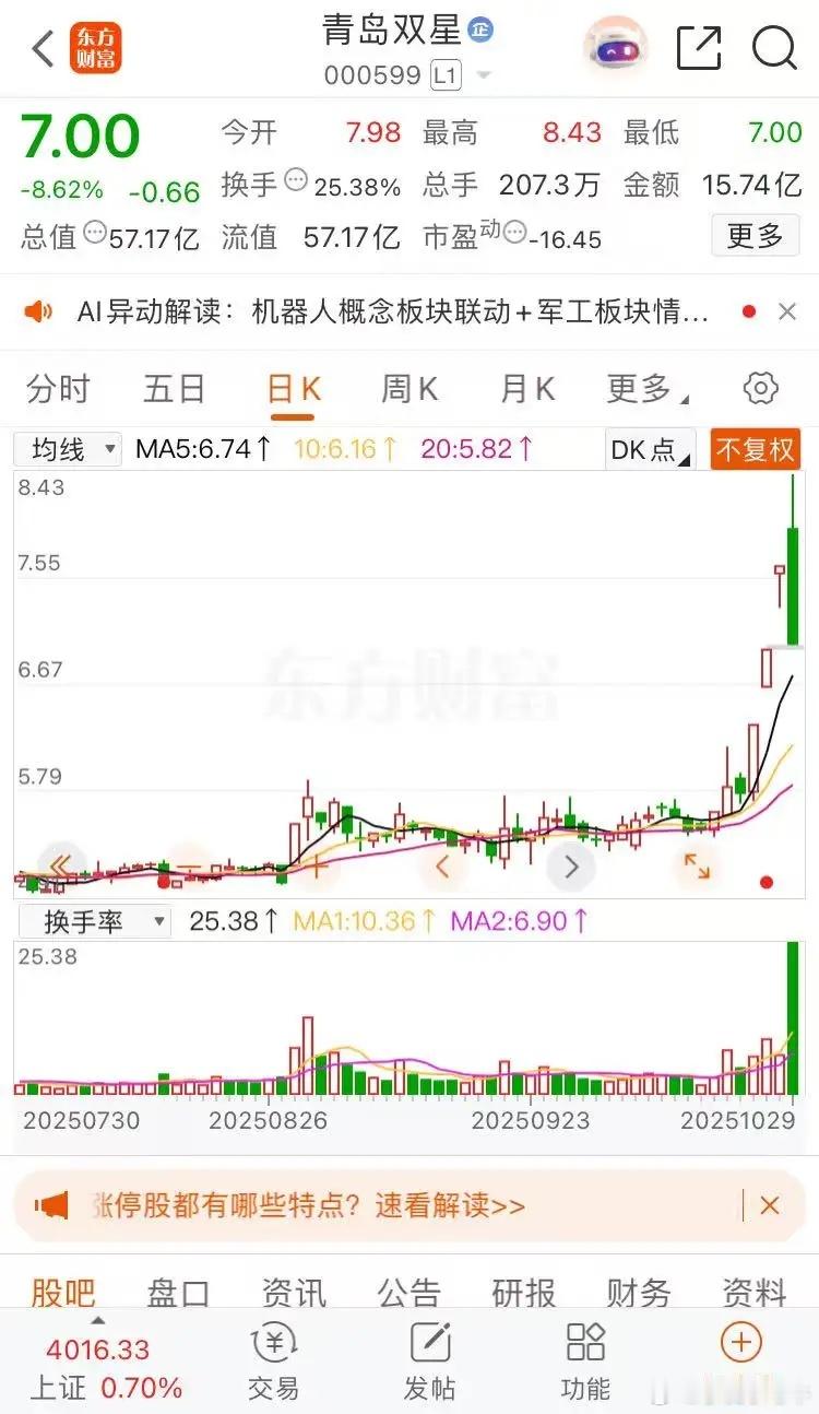 青岛双星跌幅8.62%收盘报收7.00元每股,成交金额放大到15.74亿元,明天应该反包的,不过龙虎榜东方财富家人太多,有点难搞!!!