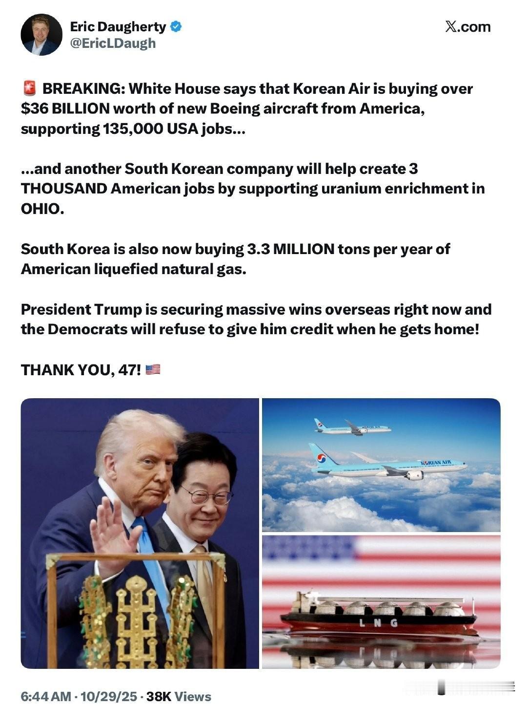 突发消息:白宫表示,大韩航空将购买价值超过360亿美元的美国波音新飞机,支持13.5万个美国就业岗位。 ……另一家韩国公司将通过支持俄亥俄州的铀浓缩工作,帮助创造3000个美国就业机会。 韩国目前每年还将购买330万吨美国液化天然气。 川普总统正在海外取得重大胜利,而民主党人却拒绝在他回国时给予他应有的赞誉!