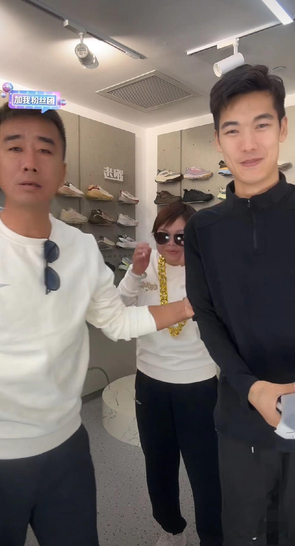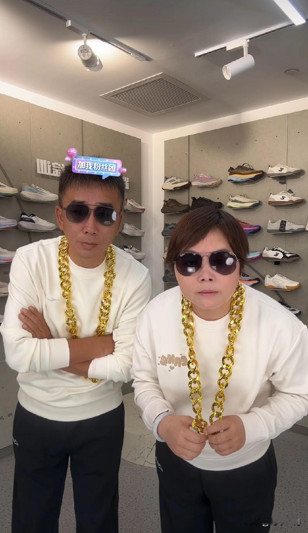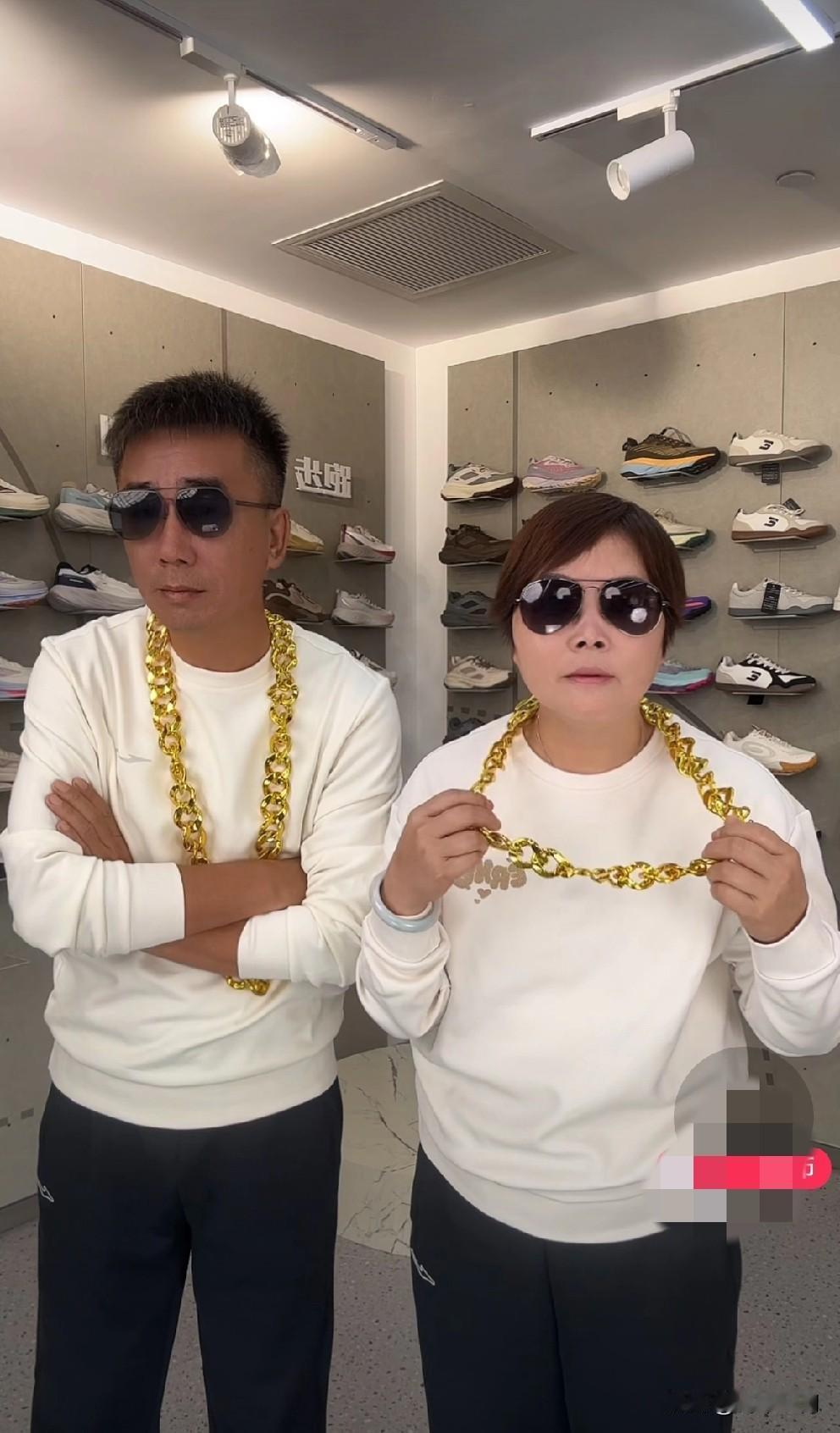 8点直播间准时开播啦。东姐和发财弟一人一副墨镜,一人一个大金链子出现在了直播间。