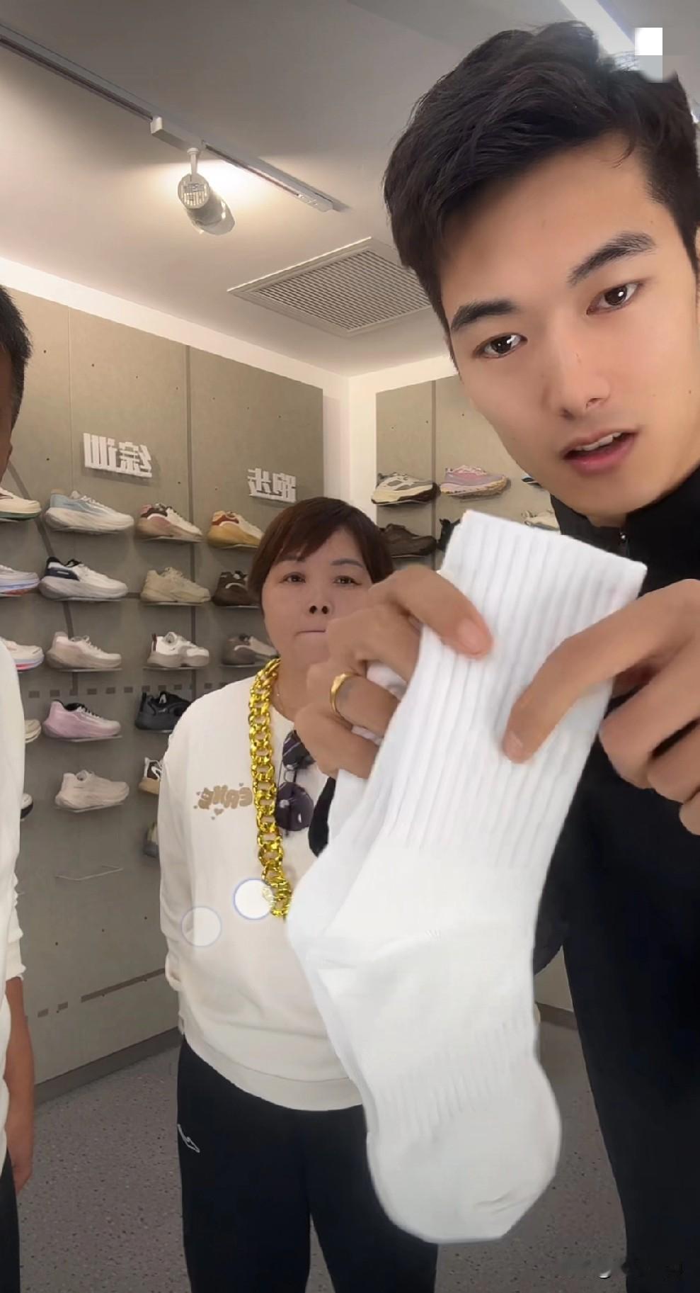 8点直播间准时开播啦。东姐和发财弟一人一副墨镜,一人一个大金链子出现在了直播间。男主播有个称号,厦门金城武,长的还真像诶。 东姐自称东莞杨贵妃。 开场就让人笑啊! 开场福利是9块9的袜子,长款短款都有,我拍了长款的,因为正想买袜子。