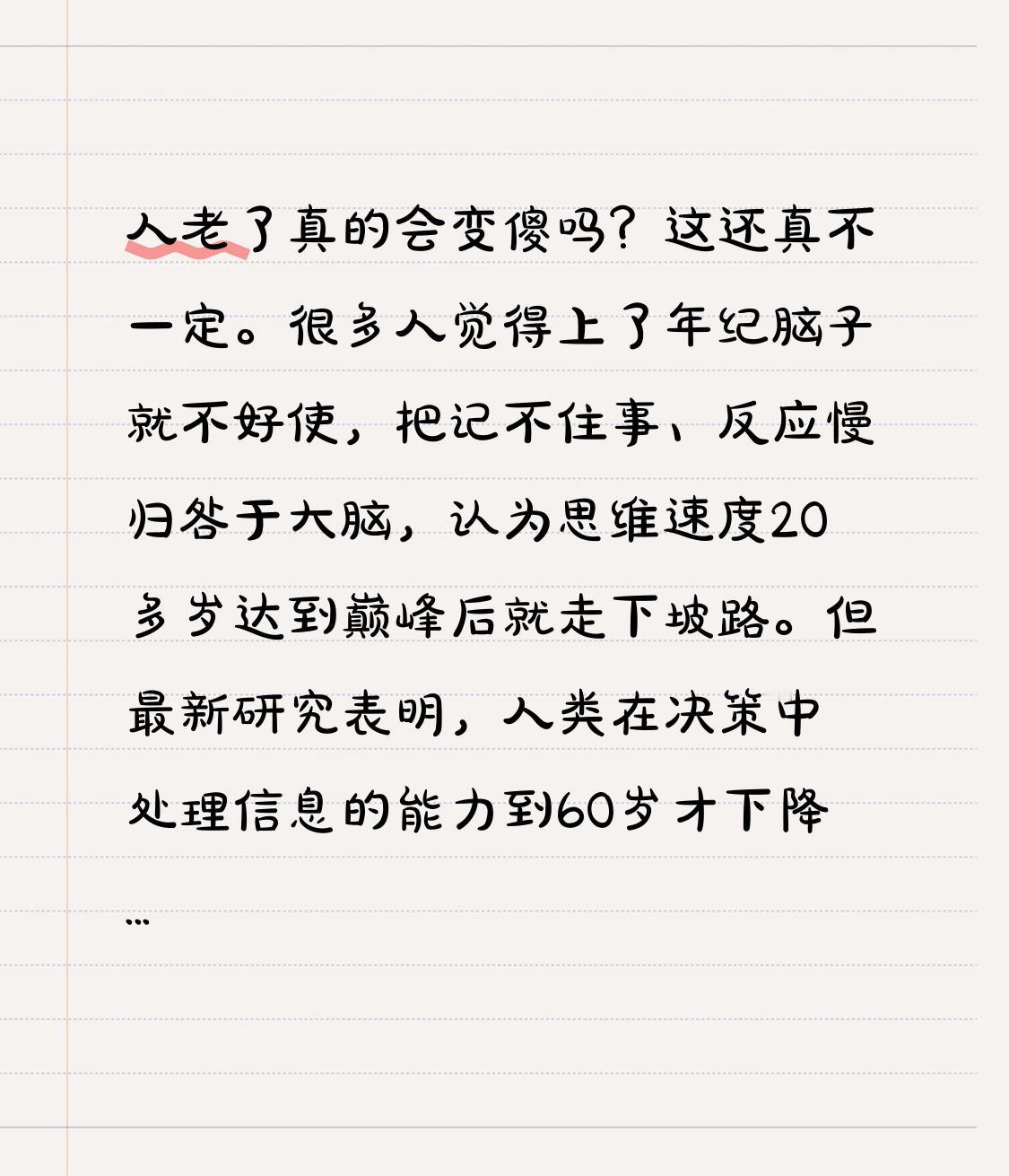 人老了真的会变傻吗?这还真不一定。很多人觉得上了年纪脑子就不好使,把记不住事、反应慢归咎于大脑,认为思维速度20多岁达到巅峰后就走下坡路。但最新研究表明,人类在决策中处理信息的能力到60岁才下降,只是年纪大了做决定更谨慎,反应时间更长。 从智力类型看,老年人的晶态智力,像表达、知识广度等,会随年龄增长上升,60岁稳定在较高水平;而液态智力,如记忆力和接受新观念能力相对欠缺。 另外,多数老人的“糊涂”是正常衰老,比如近期记忆减退、反应慢、偶尔走神等,80%的老人都有这类情况。但如果出现记忆全面崩塌等症状,就要警惕是病理原因了。