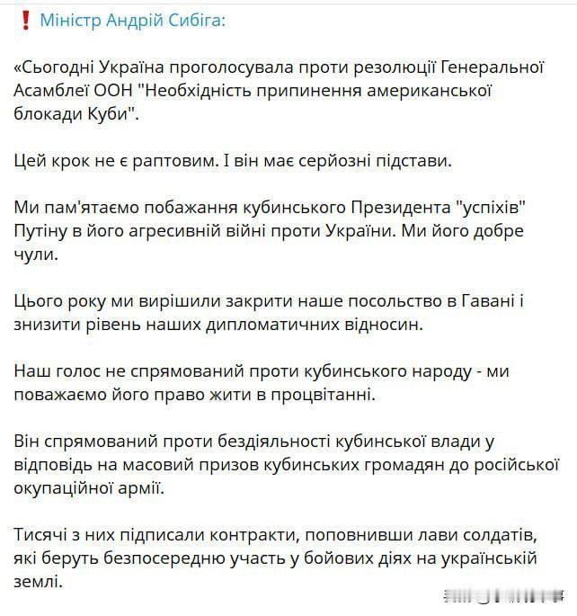 🇺🇦🇨🇺乌克兰外交部长安德烈·西比加宣布关闭乌克兰驻古巴大使馆,原因是古巴当局支持俄罗斯针对乌克兰的“侵略战争”。