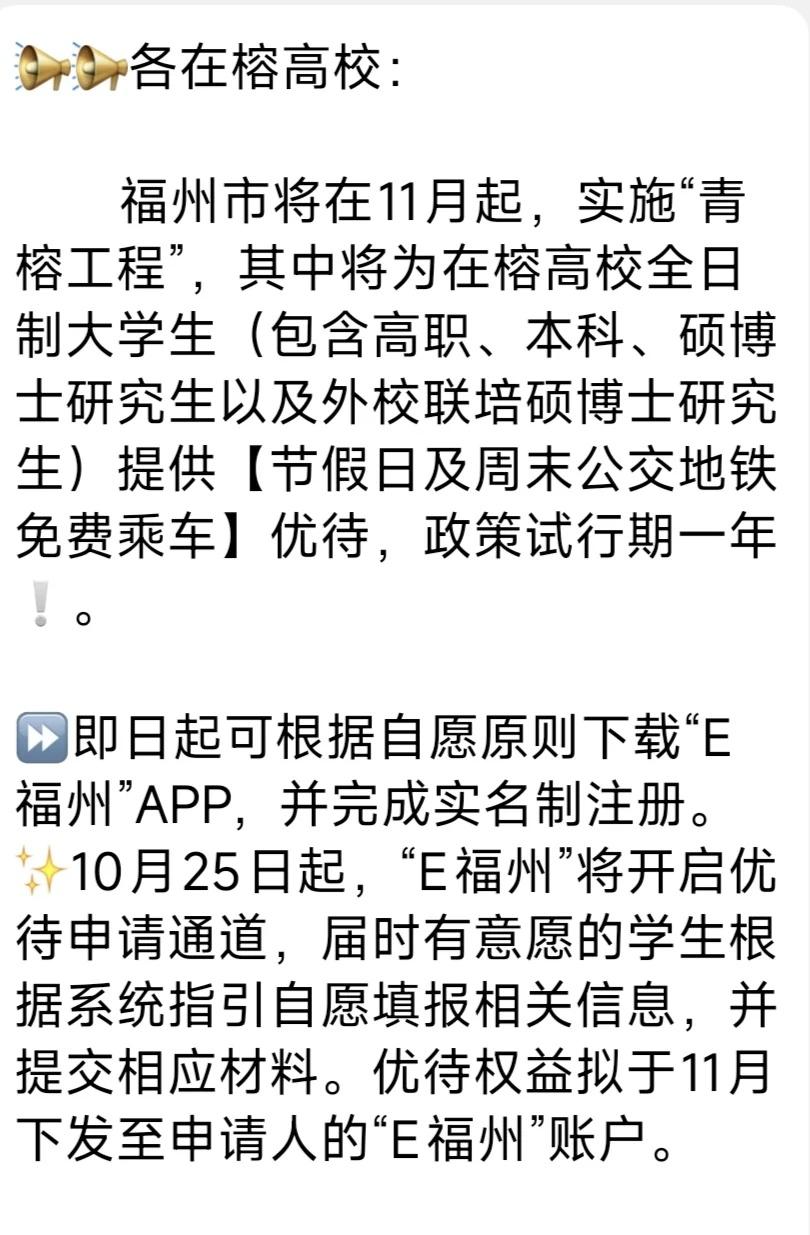 在福州读书公交地铁都是免费的 是谁羡慕了 e福州 青榕专区 领“有福青年”乘车卡 只要上传身份证照片、证件照、学信网学习在线验证报告就行公交车 高铁出行 福州地铁