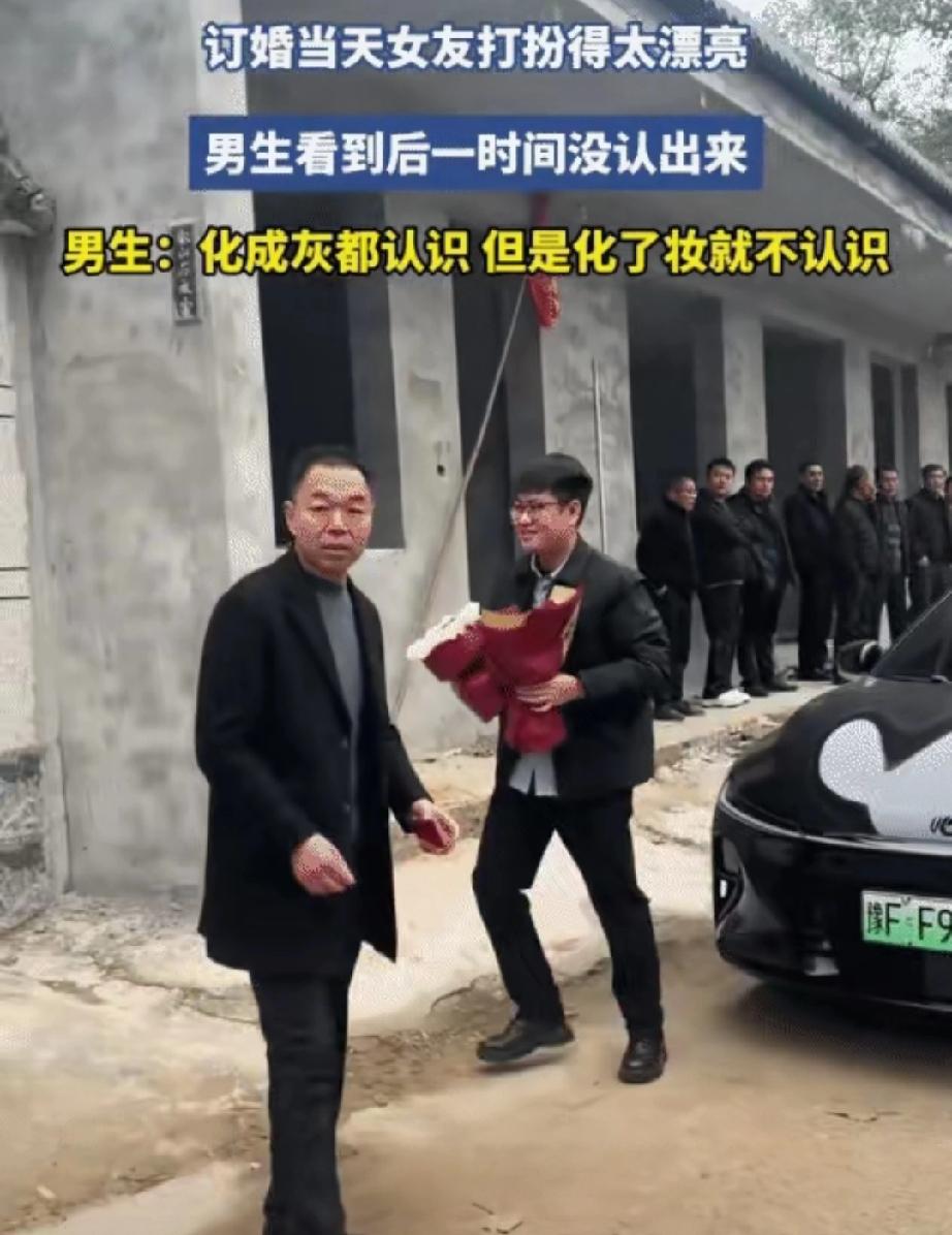 “这化妆术也太绝了吧!” 河南一男生去女友家订婚,手里拿着两束花。到女友家门口,他先给丈母娘送了一束,另一束本是要给女友的。可门口站着俩女子,其中一位是化了妆的女友,男生却没认出来,还四处张望找女友。两人对视,男生都没反应过来,直到女友转身捂嘴笑,他才认出,赶忙上前送花。男生还调侃说“化成灰都认识,但是化了妆就不认识”。这一幕逗乐了网友,大家纷纷分享自己类似的经历,有的说拍婚纱照时老公没认出自己,有的说化妆师技术堪比“易容术”。 我觉得这事儿挺有意思的,化妆前后的变化真的能这么大吗?不过也能理解男生,平时看惯了女友素颜,突然化了妆,确实容易“认生”。这也提醒我们,生活中还是得多适应适应对方的不同面貌,不然容易闹出笑话。 大家有没有遇到过这种化妆后认不出人的情况呀?快来分享分享!