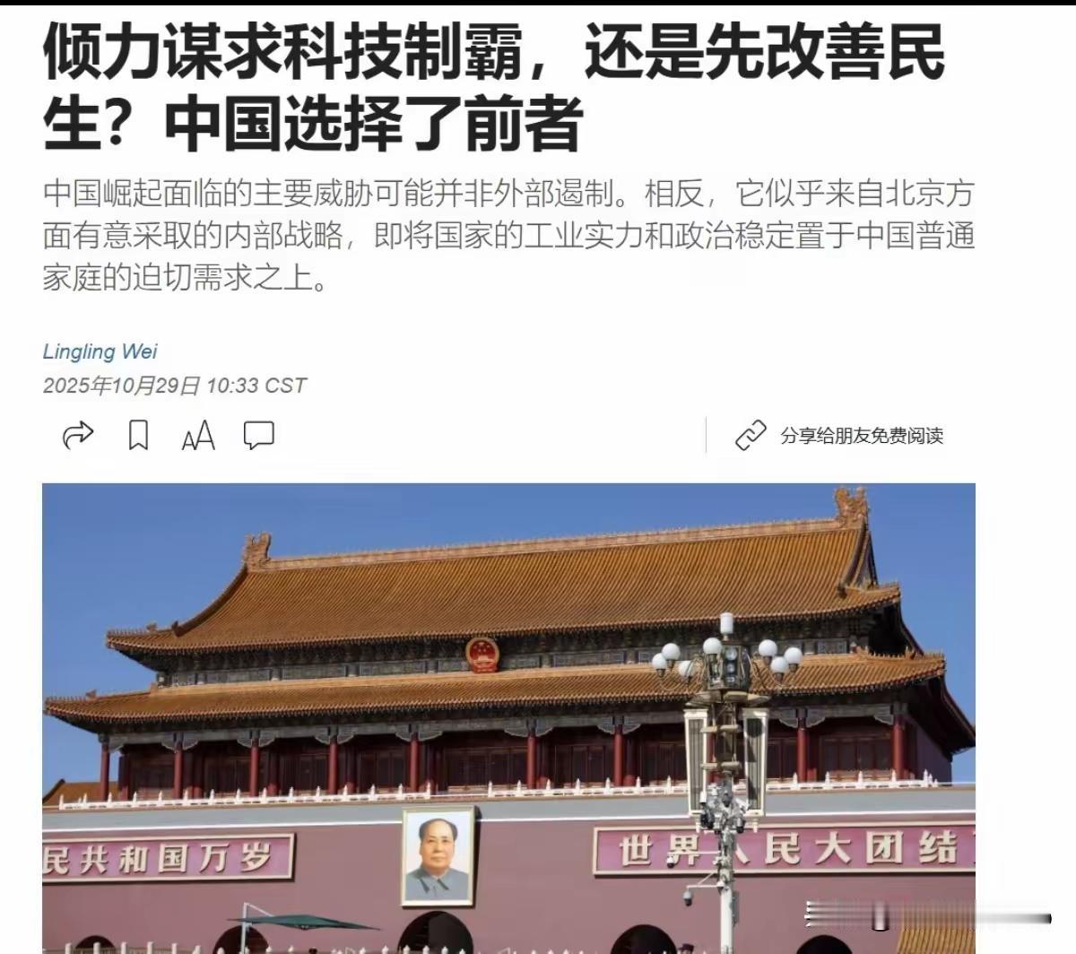 不谋求科技领域领先,不争取先进制造业霸权,拿什么来改善民生? 美国媒体制造出这样的话题,真实的目的只有一个,那就是阻止我们进行产业升级,无法解决卡脖子问题,从而放弃科技制高点,把高科技领域的制高点让给美国。 用心极其险恶!