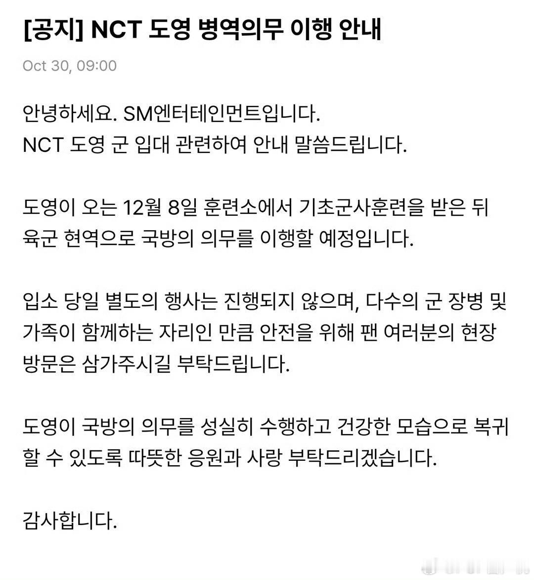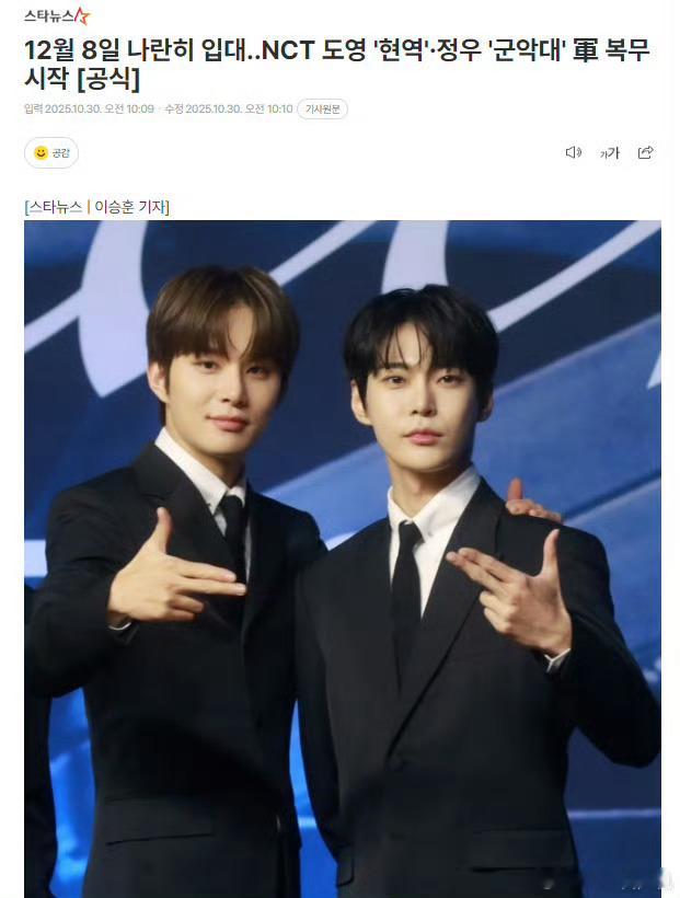 NCT成员道英与金廷祐将于12月正式履行兵役义务。