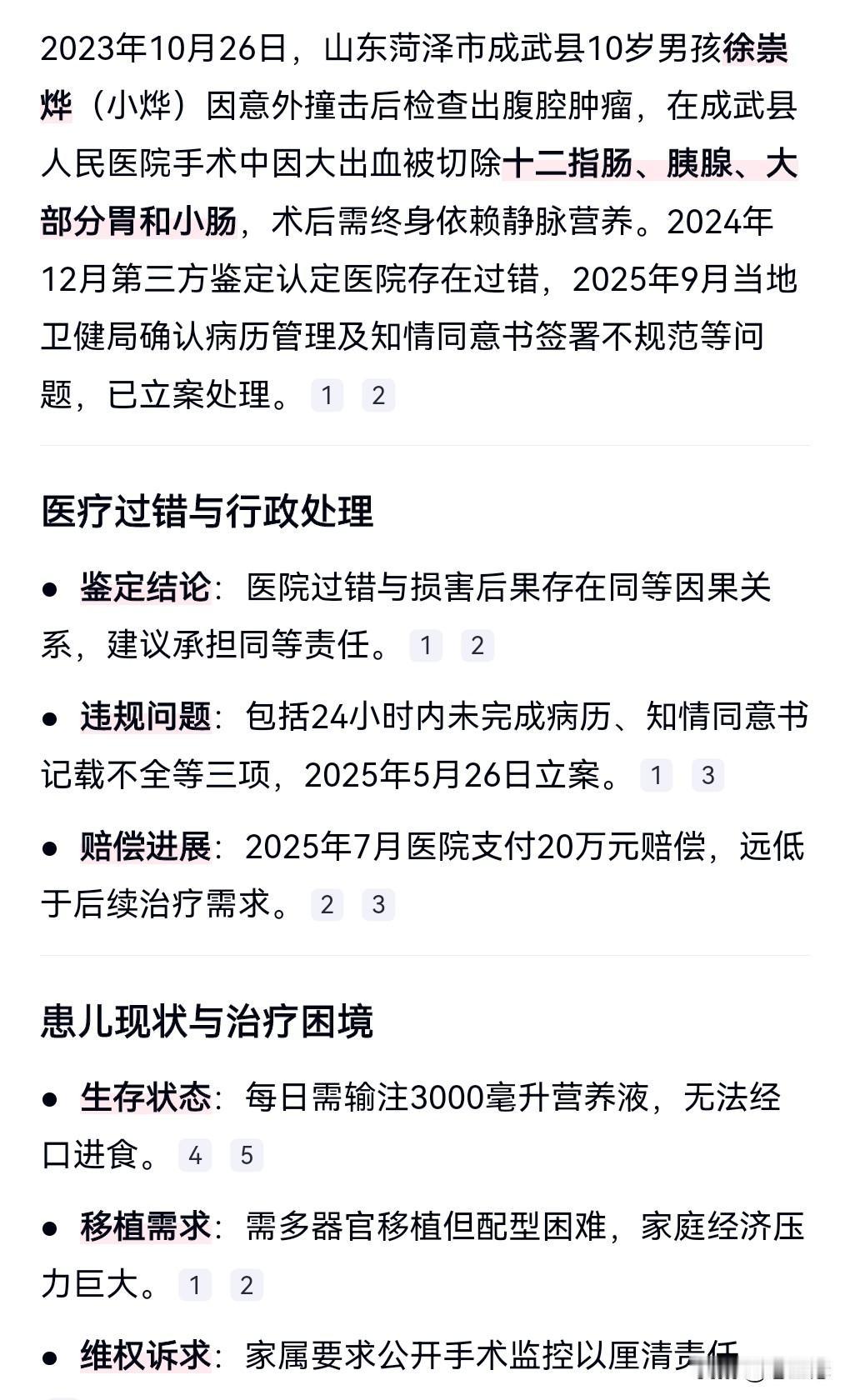 遇到这样的医院真够倒霉的,太不靠谱了。 10月30(报道),山东10岁男孩术后消化系统被切除,切除十二指肠、大部分胃和小肠等多个器官,母亲一夜白头,伸冤两年,可谓是非常的痛苦。 孩子的治疗费是个很大的数字。 孩子无法用嘴进食,只能每天输3000毫升营养液。 这真的是太惨了。 医院才赔区区的20万,这哪里够啊?