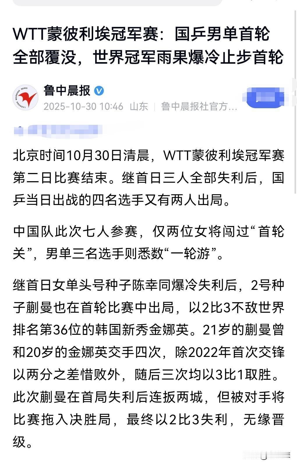 这真的是不太妙啊,10月30日(报道),国乒男单首轮全军覆没。 看来没有了主力队员,这些年轻的国乒选手还有待成长啊。 这样的战绩在以前是很少出现的。 这真是让人感到担忧啊,已经出现青黄不接的情况了。 国乒真是任重道远啊。