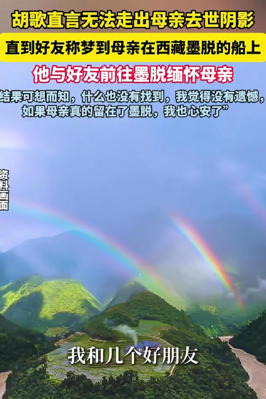 胡歌母亲离世后,朋友打电话给他:“我梦到你母亲了,她说自己在墨脱。” 胡歌的母亲是在2019年去世。 听闻朋友这番话,今年三月,胡歌便与朋友们一同前往墨脱。墨脱的彩虹及其他美景,深深震撼了胡歌。 胡歌表示:“我没找到母亲,但我想,若母亲留在了墨脱,那也没什么遗憾,我也能心安了。” 网上传言,胡歌抑郁多年或许与母亲去世有关,不过这次释怀的寻母之旅,或许能让他解开心中的疙瘩。 这或许是母亲借朋友的梦,引导胡歌摆脱内心枷锁的一种方式。又或许是朋友知道胡歌思母至深,想给胡歌一些心理安慰,才编造了一个美丽的谎言,带他走入大自然。 生离死别本就是人生的必修课,然而思念并不会随时间褪色。好好吃饭、好好生活,才是对逝者最好的告慰,毕竟他们一直盼着你过得好,你过得好了,他们也就安心了。 来源:今日频长天新闻