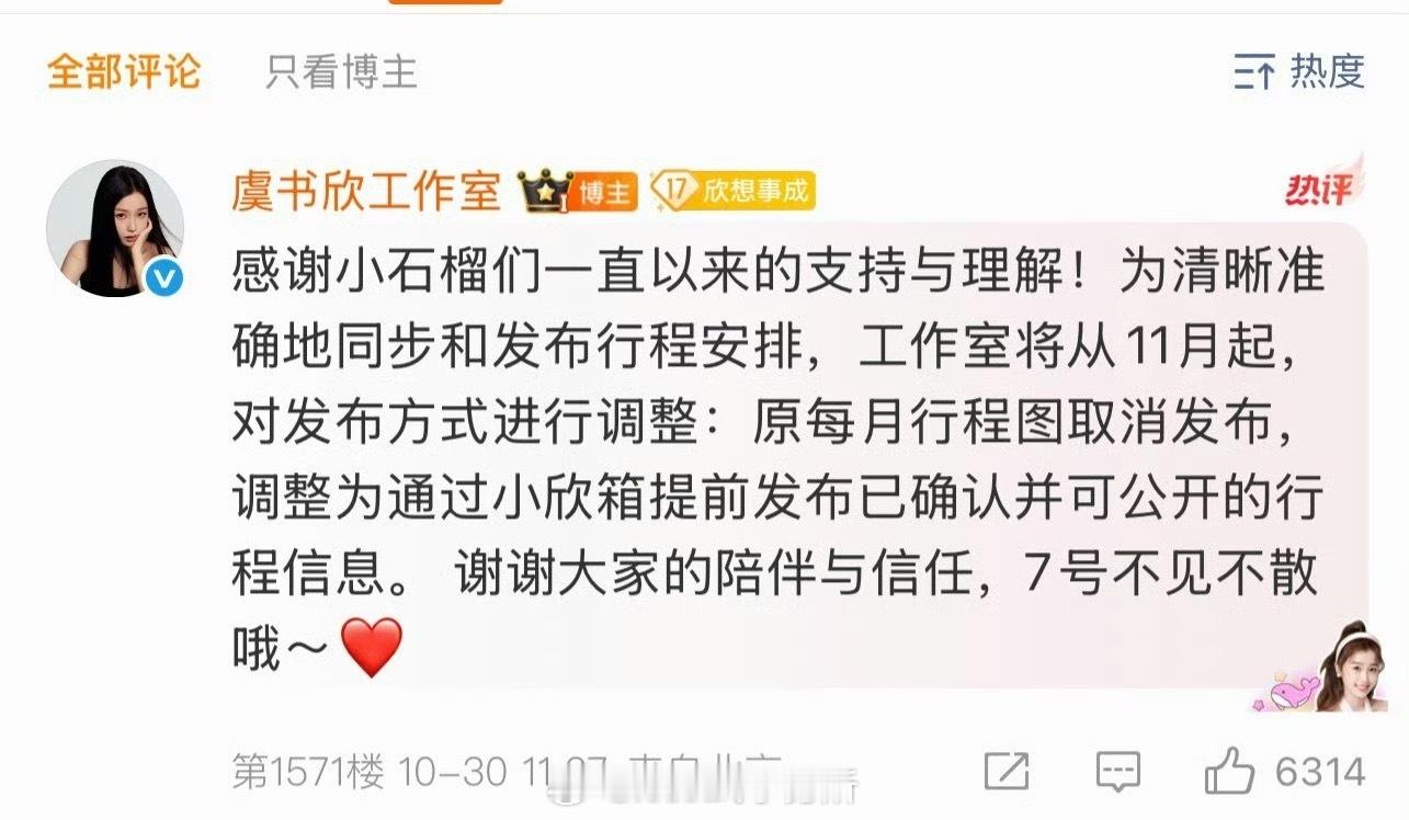 虞书欣工作室后续将不再发布每月行程图,调整为通过小欣箱提前发布已确认并可公开的行