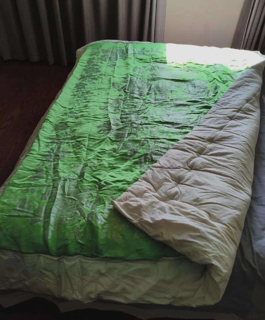 翻出婆婆几十年前的被子,一晒满是旧时光的暖。 这翠绿缎面、针脚密实的棉花被,往太阳底下一铺,光看着就泛着年代感,小时候谁家没有这么一床?盖在身上沉得压肩,可裹紧了是实打实的暖,连梦都是热乎的。 现在的被子轻得像云,却少了这种“压在身上的安全感”。婆婆说这是当年陪嫁的被,缝的时候絮了三层新棉,针脚是她自己一针一线锁的边。 晒完裹着它躺了会儿,阳光味混着旧布料的软,突然懂了为啥老人总舍不得扔老物件,这哪里是床被,是攒了几十年的暖啊。