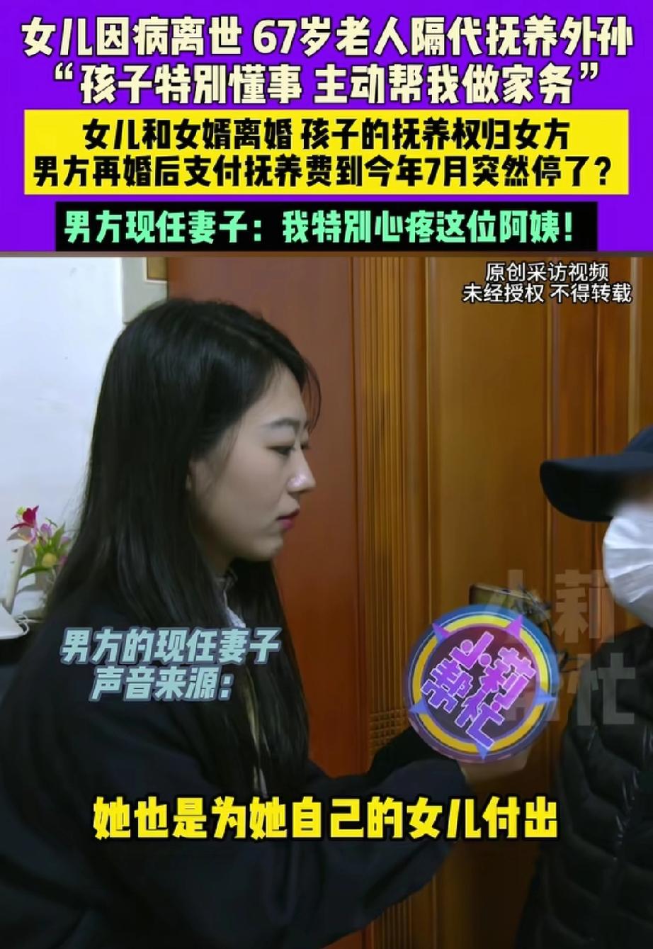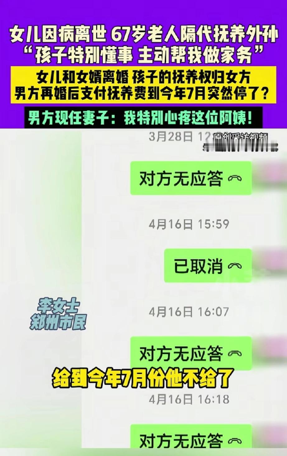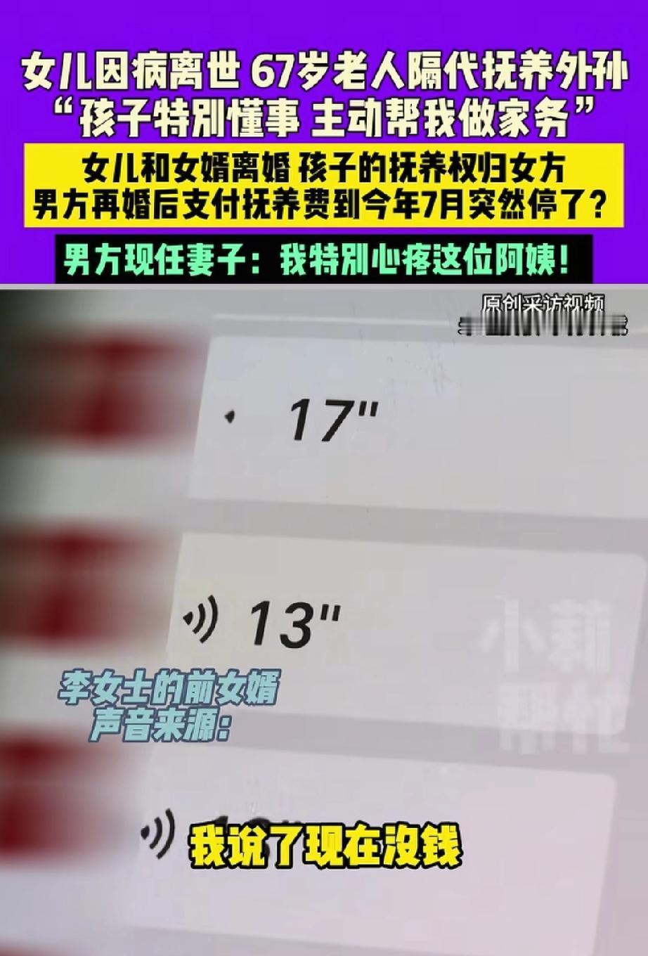 女儿离婚后不久便患病离世,留下了一个10岁的男孩。考虑到前女婿已然再婚,男孩便跟着67岁的姥姥生活,男孩的父亲每月会支付1000元抚养费。 没想到从今年七月起,连续四个月父亲不再给男孩抚养费。 姥姥每次打电话去要钱,孩子父亲态度极差,直说:“我媳妇怀孕了,没钱,没钱,你怎么老打电话?”随后拉黑了姥姥的电话。 姥姥向“小莉帮忙”的记者求助。 记者拨通了父亲现任妻子的电话,妻子诉说了自己的难处:“我和他结婚后,生了两个孩子,他基本都不管这俩孩子。” 接着又提到男孩:“他没了母亲,父亲又不爱他,怪可怜的。这位大姨能替女儿担起养育孩子的责任,我很佩服。你们放心,我去联系他,让他转钱。” 从父亲现任妻子的话语中,能看出她是一位有正义感、知书达礼的女性。 不久后,姥姥微信收到父亲转来的2000元,并承诺余下的2000元下个月给。 世间幸运无数,不及遇见她。她明事理、懂分寸,以教养化解矛盾,用温柔治愈疲惫。这样的伴侣可遇不可求,希望这个男人能好好珍惜,珍惜方能长久相伴、岁月长安。 来源:小莉帮忙