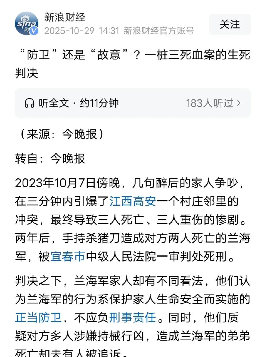 江西高安,男子突然听到母亲大喊救命,他冲出家门,就看到弟弟跪倒在沟里,有几个人正在揍弟弟,男子气愤不已,转身回屋拿了把刀具,冲出去就一顿乱挥舞,最后,导致2人死亡,3人重伤,男子弟弟也不幸身亡,男子很快被抓,没想到,两年后,一审法院判决男子被判死刑。家人懵了,认为男子是保护家人性命才动手,属于正当防卫,不应该负刑事责任,于是提起上诉。二审结果如何呢? 兰海和兰建是亲兄弟,兰海是哥哥,他们家隔壁住的是杨卫、杨灿一大家子。 2023年10月7日傍晚,兰建去朋友处喝酒回来,母亲看到他喝得醉熏熏的,忍不住唠叨了两句。 已经醉酒的兰建不满母亲的指责,就跟母亲吵了起来,你一句我一句,越吵越凶。 谁料,住在隔壁的杨卫母亲何大娘以为兰建在指桑骂槐,骂自己,她气不过,直接冲到厨房门口,跟兰建对骂起来。 两人越吵越凶,很快何大娘的亲属也加入其中,一时之间两帮人对吵。 何大娘还不解气,打电话给自己的儿子杨卫和杨灿,说她被兰建欺负了,让他们赶紧回来讨说法。 6、7分钟后,杨卫和杨灿从外面急匆匆赶回来,他们来到两家之间的晒场,质问兰建为何辱骂他们母亲? 本就醉酒的兰建不明所以,跟着杨家两兄弟对吵,争执了几分钟,发展到肢体冲突。 兰建上前推搡了一下杨卫,杨卫、杨灿兄弟俩一气之下直接挥拳而上。 这时在场的杨家亲属杨龙也加入打斗中,他手持一把刀具加入其中,有目击者称,杨龙一上去就拿刀捅刺兰建。 兰建母亲看到杨龙这么对儿子,她吓得大喊救命。 这时,在家中看电视的兰海听到母亲的喊叫声和外面的打斗声,他赶紧冲出家门,来到家门口,他看到兰建跪倒在沟里,白色衣服被染红。 兰建跪倒在沟里,显得无助又可怜,杨卫、杨灿和杨龙三人正你一拳我一脚揍他。 兰海气得火冒三丈,他转身直接冲到客厅,在客厅的桌子上,拿了把刀具冲出家门。 兰海冲到兰建跟前,把他护在身后,一顿乱挥舞,周围的人因为兰海突如其来的加入,纷纷受伤。 整个过程就持续两三分钟,杨龙和杨卫被兰海弄倒后不省人事,杨灿等三个杨家人也身受重伤,晒场上乱成一团。 当天晚上,杨龙和杨卫因为伤势过重相继死亡,杨灿等杨家亲属共三人被紧急送医救治。 兰建也在家人的陪伴下及时送到医院,但由于伤得太严重,于次日下午不治身亡,而兰海也因为自己一时冲动很快被抓。 后来经过法医鉴定,兰建属于心脏刺创死亡,凶器是单刃锐器,与杨龙所带的刀具特征吻合。 事后,兰海被指控故意伤害罪致2死3重伤,但他家人和律师辩称兰海是正当防卫(甚至特殊防卫)。 兰海家属和律师认为,当时杨家还在打他弟弟兰建,他那是救人。 但法院认定兰海提前准备了刀具,冲出去时对方已经后退、弟弟也安全了,他却主动捅人,超出防卫限度,主观是打架不是防卫。 2025年7月25日,一审判决兰海死刑,还要赔偿对方45.7万。 兰海妻子不接受死刑判决,她称丈夫是见弟弟被打才冲出去,当时天黑看不清情况,而且当时对方也没停止攻击。 兰海妻子心里特别不服气,弟弟兰建都被害死了,但杨家那些参与围殴、攻击兰建的人,却没有一个被追究刑事责任,相当于没受到法律惩处。 她觉得杨家好多人都动手害了弟弟,就算主要凶手杨龙死了,其他人也该承担相应的法律责任,不该就这么算了。 但警方说兰建是已死亡的杨龙害的,没证据证明其他人有责任。 2025年7月25日,一审判决后,兰海家属提起上诉,目前案件正在二审审理中。 这起悲剧全是“冲动”和“误解”酿的祸。 兰建醉酒后和母亲争吵,本是家事,何大娘却不分青红皂白误以为被辱骂,直接参与对骂还喊家人撑腰,一步步点燃矛盾。 杨家兄弟接到电话不分缘由就动手,杨龙更是持刀伤人,彻底升级冲突。 兰海听到母亲呼救,目睹弟弟被殴打,怒火冲昏头脑回屋拿刀反击,远超防卫限度,最终造成两死三重伤的悲剧。 但凡有一方能冷静克制,何大娘不盲目护短,杨家兄弟先弄清真相,兰海少点冲动,悲剧都不会发生。 遇事别被情绪裹挟,冷静沟通才是解决问题的关键。 《刑法》第20条第2款规定,正当防卫明显超过必要限度造成重大损害的,应当负刑事责任,但是应当减轻或者免除处罚。 结合本案,兰海的行为属于防卫过当。虽然兰海在听到母亲呼救、看到弟弟被殴打后,出于保护弟弟的目的拿刀具反击,具有防卫意识和防卫意图。 但根据法院认定,他在对方已经后退、弟弟安全的情况下,仍主动伤人,其防卫行为明显超过了制止不法侵害所必需的限度,且造成了2人死亡、3人重伤的重大损害后果,不符合正当防卫的限度条件。 因此,一审法院根据刑法第20条第2款的规定,认定兰海构成故意伤害罪并判处死刑,符合法律规定。 不过,考虑到其具有防卫性质,在量刑时可能依法考虑减轻或免除处罚的情节。 对此,大家怎么看? 关注@猫眼学法 品读案例故事,学习法律经验。头号创作者激励计划