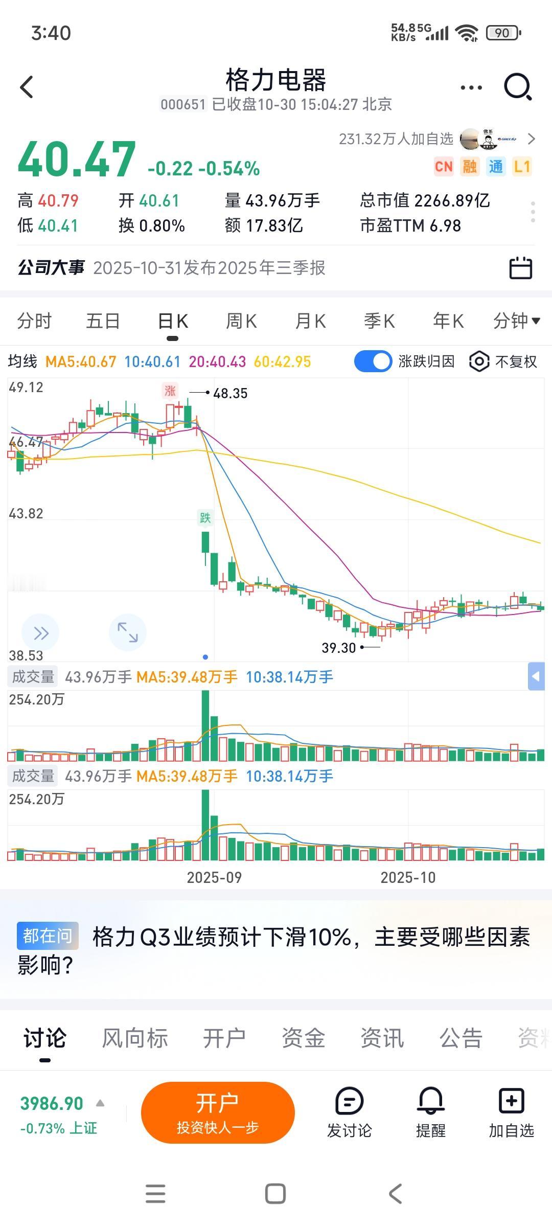 三大白电企业,美的集团与海尔智家今天都逆市上涨,唯独格力电器下跌... 半年报公布时,美的集团与海尔智家的业绩都是上涨的,唯独格力电器的业绩下跌... 第三季度,在国补退潮的情况下,美的集团依旧保持增长,今天晚上就看格力电器与海尔智家的情况了... 而从今天的股价表现来看,大概率又是格力电器业绩在下滑[捂脸]...