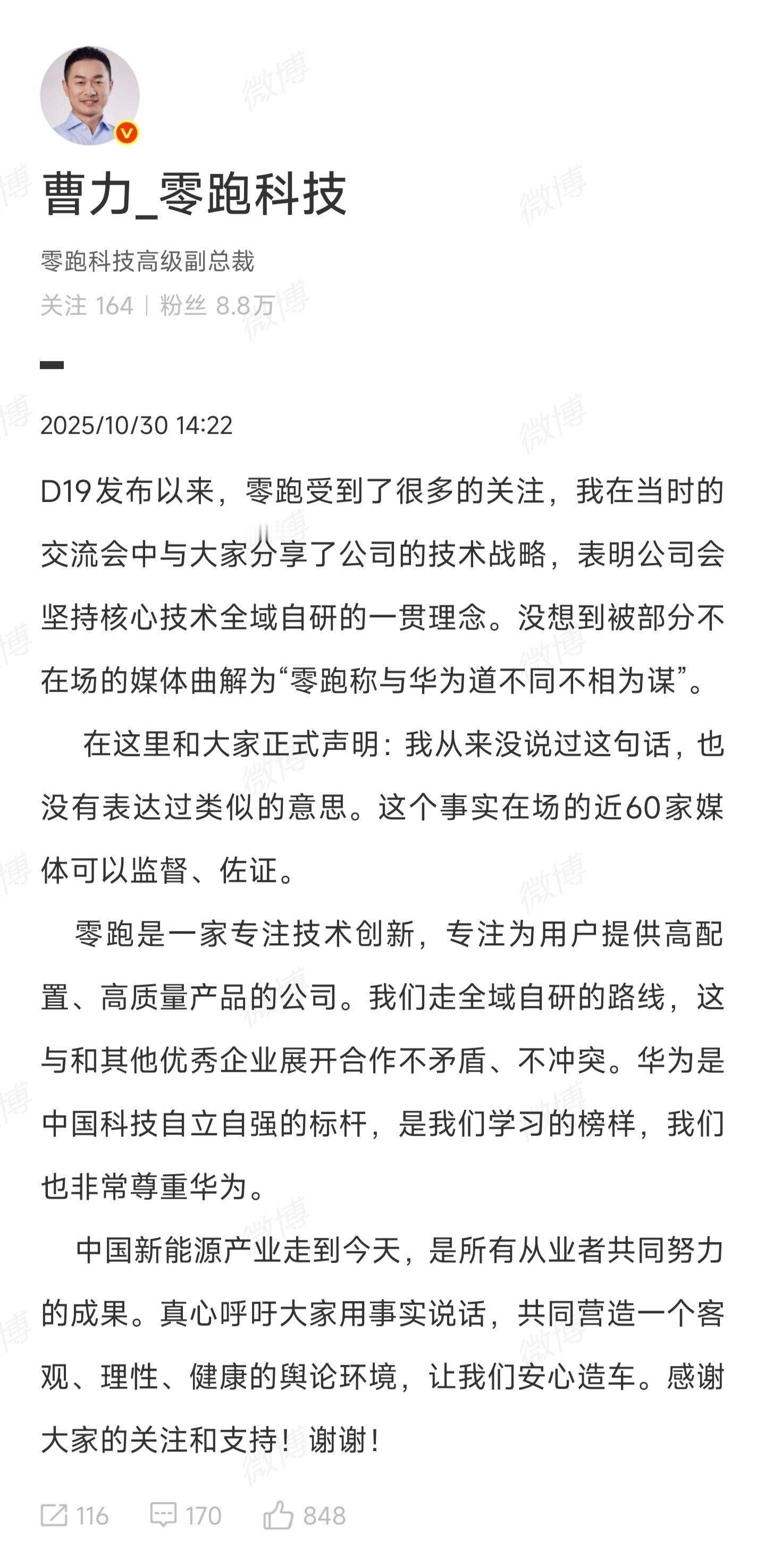 零跑副总裁发声明:从来没说过“零跑与华为道不同不相为谋”,也没有表达过类似的意思。