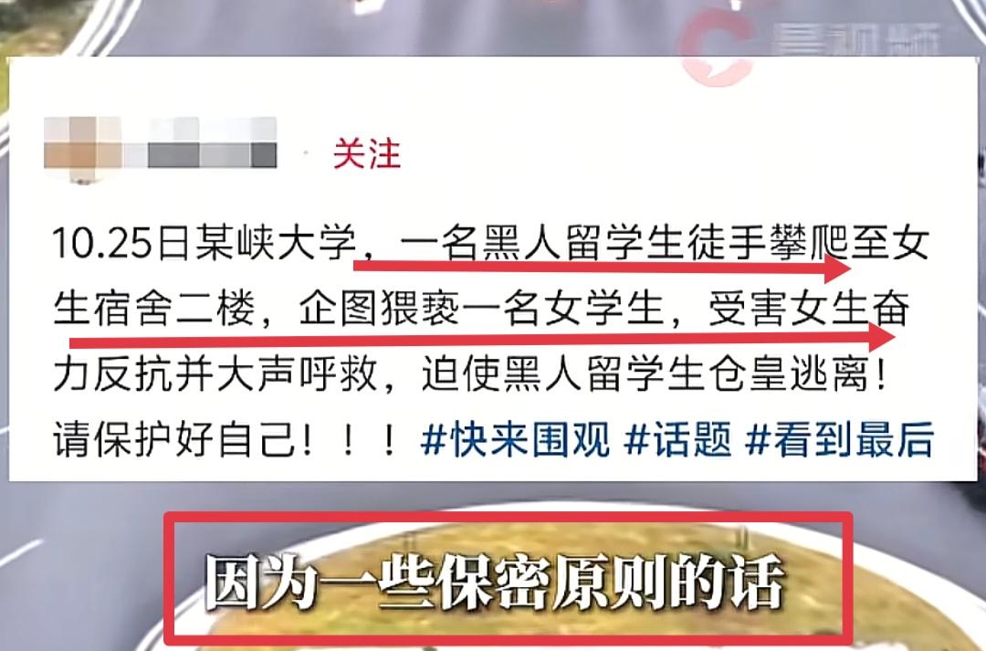 胆大包天!谁能想到,高等学府里竟会发生外国留学生夜闯女生宿舍的事? 最近三峡大学的学生群里炸开了锅,一件让女生们细思极恐的事在校园里发酵。谁也没料到,本该安全的学生宿舍,竟然会在深夜闯进不速之客,还是一名外国留学生。 受害女生反抗时被打伤,更让人窝火的是,学校起初的态度竟是想“冷处理”,要不是学生们忍不住在网上曝光,这事儿恐怕真就被悄悄压下去了。 事情发生在10月25日凌晨两点多,正是人们睡得最沉的时候。三峡大学南苑学生公寓里,女生们在各自的床位上酣睡,楼道里只有应急灯亮着微弱的光。就在这时,一个身影鬼鬼祟祟地出现在宿舍楼下,他是学校的外籍留学生。 在楼下徘徊观察了好几分钟,他盯着楼层窗户看了一圈,竟发现一楼窗户上的防盗钢刺有可乘之机——虽然设计用来防盗,但间距刚好能让他踩着往上爬。于是他借着夜色掩护,一步步攀爬至二楼阳台,随后撬开了阳台门溜进了女生宿舍。 睡梦中的女生突然被异响惊醒,睁开眼就看到一个陌生的外国男子站在宿舍里,瞬间吓得尖叫起来。为了保护自己和室友,她鼓起勇气上前反抗,过程中双方发生肢体冲突,女生的手臂和颈部被对方抓伤,还有轻微的撞击伤。 室友们也被惊醒,纷纷出声呵斥,这名留学生见势不妙,才慌忙从阳台逃离。事后女生惊魂未定,第一时间联系了宿舍管理员和辅导员,本以为学校会立刻严肃处理,没想到得到的回应却是“先冷静,不要声张,学校会协调解决”。 这样的处理态度让女生和同学们十分不满。受伤的女生去医院做了检查,诊断报告显示有多处软组织损伤,而学校除了安排人员陪同就医外,对于事件的调查进展和处理方案始终含糊其辞。 有学生透露,事发后学校加强了宿舍楼下的巡逻,但对于涉事留学生的处置却迟迟没有公开信息。直到10月27日,有学生将事件经过和受伤照片发布到社交平台,相关话题才迅速引发关注,网友们纷纷质疑学校的安保措施和处理方式,要求给出明确说法。 事实上,高校留学生管理问题并非首次引发争议。此前某高校也曾发生过留学生违反宿舍管理规定的情况,当时学校的处理方式同样引发了“双重标准”的质疑。 对于三峡大学此次事件,不少网友表示,无论国籍如何,违反校规校纪甚至危害他人安全的行为都应该受到严肃处理,不能因为是留学生就网开一面。而保障学生的人身安全,加强宿舍安保措施,更是学校的基本责任。 截至目前,三峡大学官方已经发布了情况说明,称涉事留学生已被公安机关依法传唤调查,学校将根据调查结果依规依纪处理,并进一步加强校园安全管理和留学生教育管理工作。但对于学生们关心的具体处理结果和后续安保升级措施,仍需等待更多信息。 本文信源:三峡大学官方情况说明