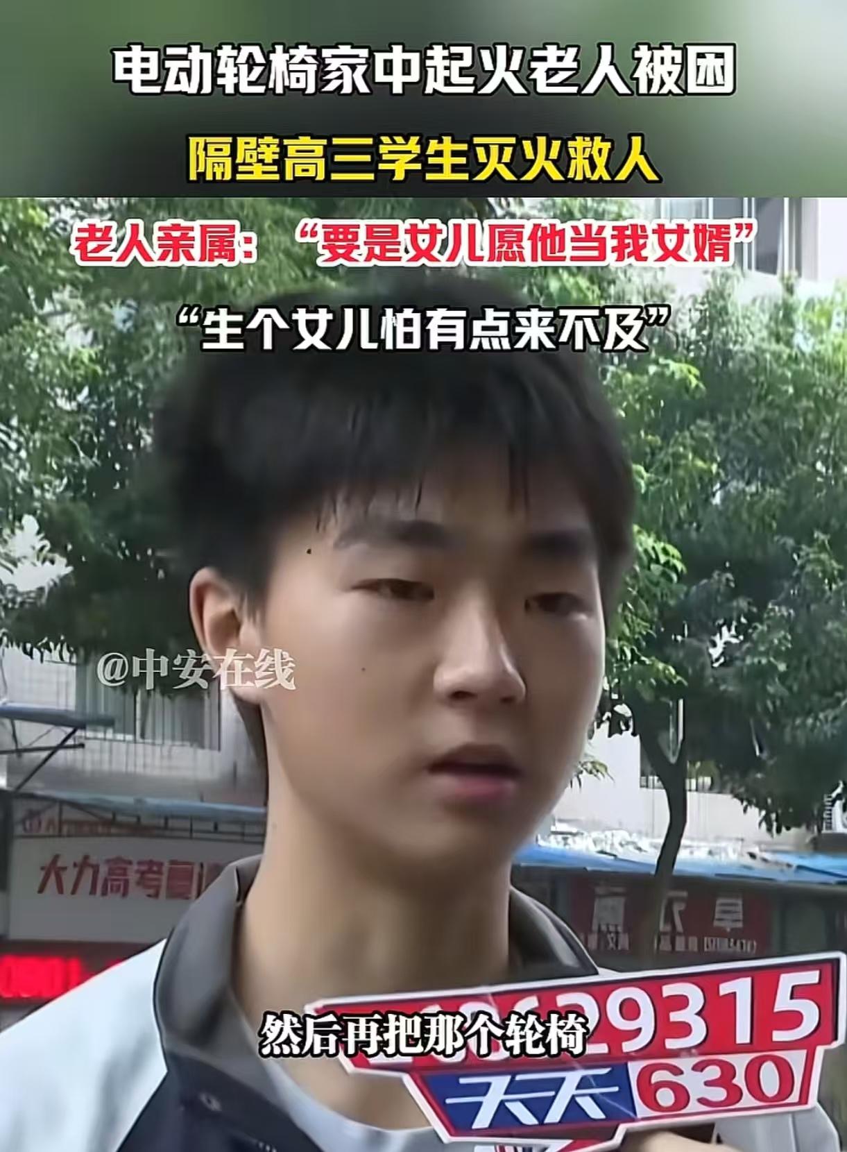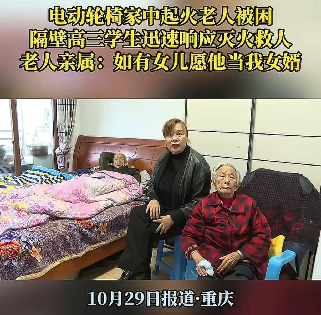 一想到他穿着摇裤救人,我就想哭!重庆一独居老夫妻在家里给电动轮椅充电,突然就发生着火,火势迅速蔓延整个房间,老人在无助之下,被一名小伙穿着摇裤冲进来,把她救了出去。 据重庆天天360的报道,事情发生在10月29日,救人的小伙是一名高三学生,就住在老人隔壁。 当小伙发现老人家里着火时,他冷静分析现场火势,在确认自己能成功救人的情况下,他来不及穿上衣服,只穿了一条摇裤就冲了进去。 小伙在采访中表示,他没有想太多,只知道老人的生命重要一点,在他把老人从火势里抱出来后,他再回去把轮椅电瓶断电,成功阻止一场灾难的发生。 事后,老人女儿了解到情况后,买来礼品找到小伙,想表达感谢,并表示:她要是有女儿,一定要喊小伙做女婿。 看到小伙救人事迹后,网友都为小伙的勇敢和智慧表示认可和夸奖。 甚至有网友调侃老人女儿,没有女儿就生一个吧! 但老人女儿表示,现在生已经晚了,索性就把小伙认作干儿子。