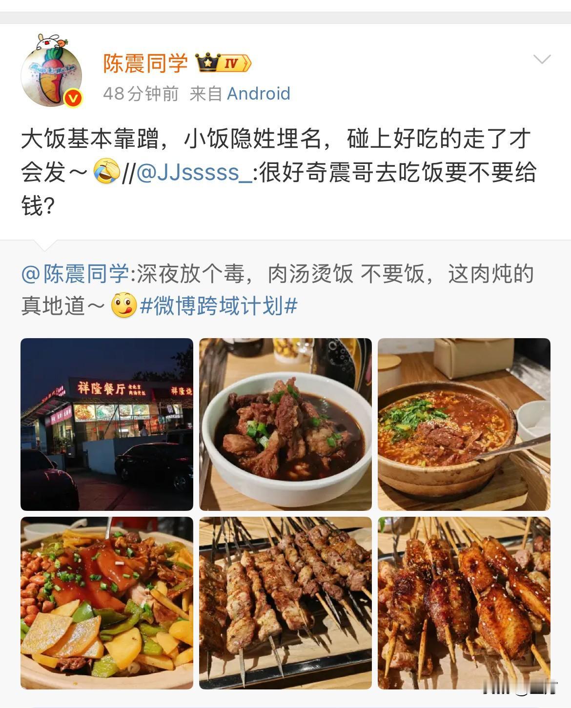 陈震谈吃饭会不会给钱? 可能普通人问这个问题,听起来有点滑稽,但是他还真的会考虑这个问题: 因为大家会经常看到,他在社交网络上基本上隔三差五的会晒出,自己吃的各种美食的时候,同时他也会不经意地,把这个美食的店的名字以及地址标下来。 要知道,他全网好几千万粉丝,任何一个店主,不管多么的好吃多么的豪华或者多么的稀有,也不管这个老板是他朋友也好,还是真的做生意,只要能够请他去能够吃一顿饭,人家压根就不会收他的钱。 但是陈震也有自己的大原则,那就是那种比较大的宴请,基本上他都是蹭人家的,而且他也会主动发出来,说白了就是商业互惠,但是小的他就不会发了那种特别好吃的,他也不会推荐大家去,因为真正的好吃,不用宣传。 当然,每次碰到这种情况,如果是朋友的话,人家一定不会收他的钱,但是他吃完饭走了之后会悄悄地发给人家。