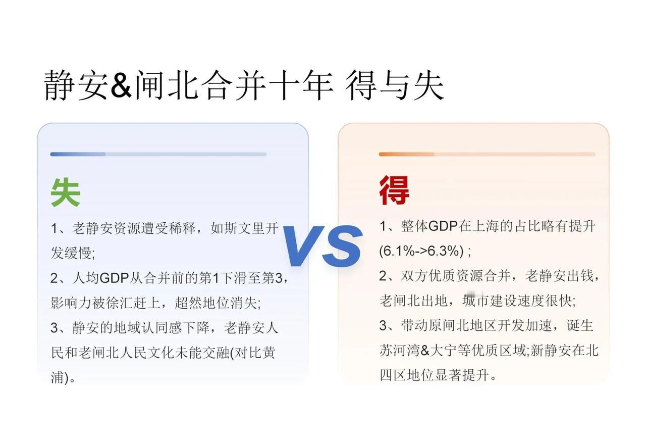 静安、闸北合并10周年了!双赢还是遗憾? 2015年10月,静安与闸北正式合并,变成新静安。如今十年已过,这次合并是否成功? 从整体发展来看,合并无疑具有积极意义。双方实现了资源互补:老静安提供经济支持,老闸北贡献土地,共同推动苏河湾、大宁等新兴板块崛起,有效带动了北上海市区的整体发展。合并后静安区的GDP占全市比重稳中有升,也印证了“1+1>2”的协同效应。 不过,对于“310106”老静安土著来说,感受可能复杂。合并前,老静安人均GDP稳居全市首位,明显高于黄浦等区;而如今已滑落至第三,有被徐汇赶超的趋势。 而且老静安,如斯文里等区域更新节奏放缓,热度也逐渐被徐汇滨江等板块分流。 当然,身份认同终究是带有主观色彩。静安、闸北的合并,我认为算成功的。大家怎么看?[鼾睡] 上海城市更新 上海发展 地段决定价值 城市发展潜力 静安区