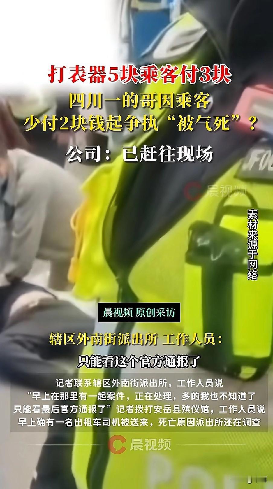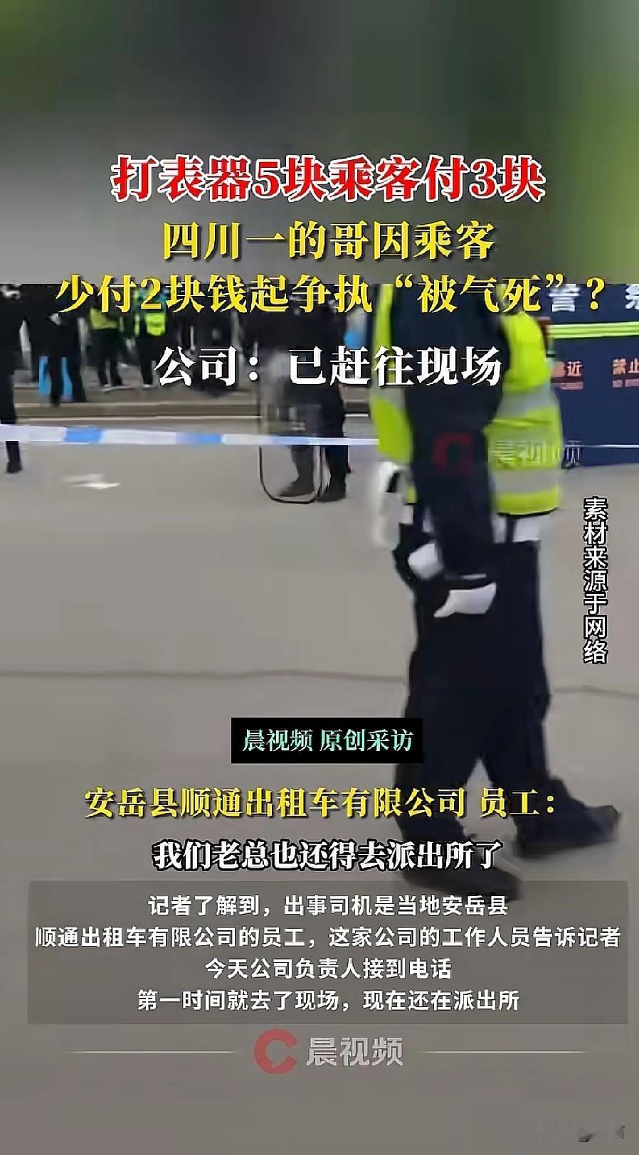 10月30日四川资阳安岳县,一名四五十岁的出租车司机和乘客起了争执,之后不幸离世。 打表显示车费5元,乘客只付了3元,差了2块钱。两人为此争执起来,司机突然出了状况,像是脑梗或心脏出了问题,现场有人赶紧做胸部按压急救,民警也来了,还拉了警戒线 。 司机家里有老小,是当地顺通出租车公司的。公司说负责人第一时间到了现场,还在配合派出所调查,车上视频已经交给刑警大队,乘客信息也掌握了 。 派出所证实早上在处理这事,殡仪馆也说收了这名司机,不过具体死因还得等警方的官方通报。 就2块钱的事儿,闹成这样真让人唏嘘。谁也不知道对方正背着什么压力,遇事各退一步,多份理解,或许就能避免悲剧。