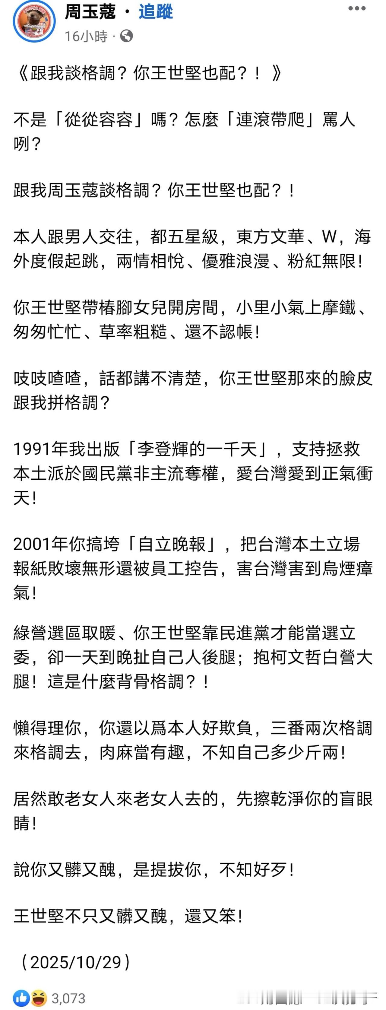 王世坚周玉蔻再开战!一个骂臭又脏!一个批没格调老太太!还拿开房说事! 最近因为明年台北市长民进党提名,知名谣棍媒体人周玉蔻和民进党大网红王世坚又吵起来了。周玉蔻骂王世坚臭又脏,王世坚回应称:他不评论没格调的老太太! 对此,周玉蔻再写长文回应,竟称自己和男人开房都是五星级酒店,嘲讽王世坚出轨带小三开房是去摩铁匆匆忙忙!笑死了,竟然如此骂战!