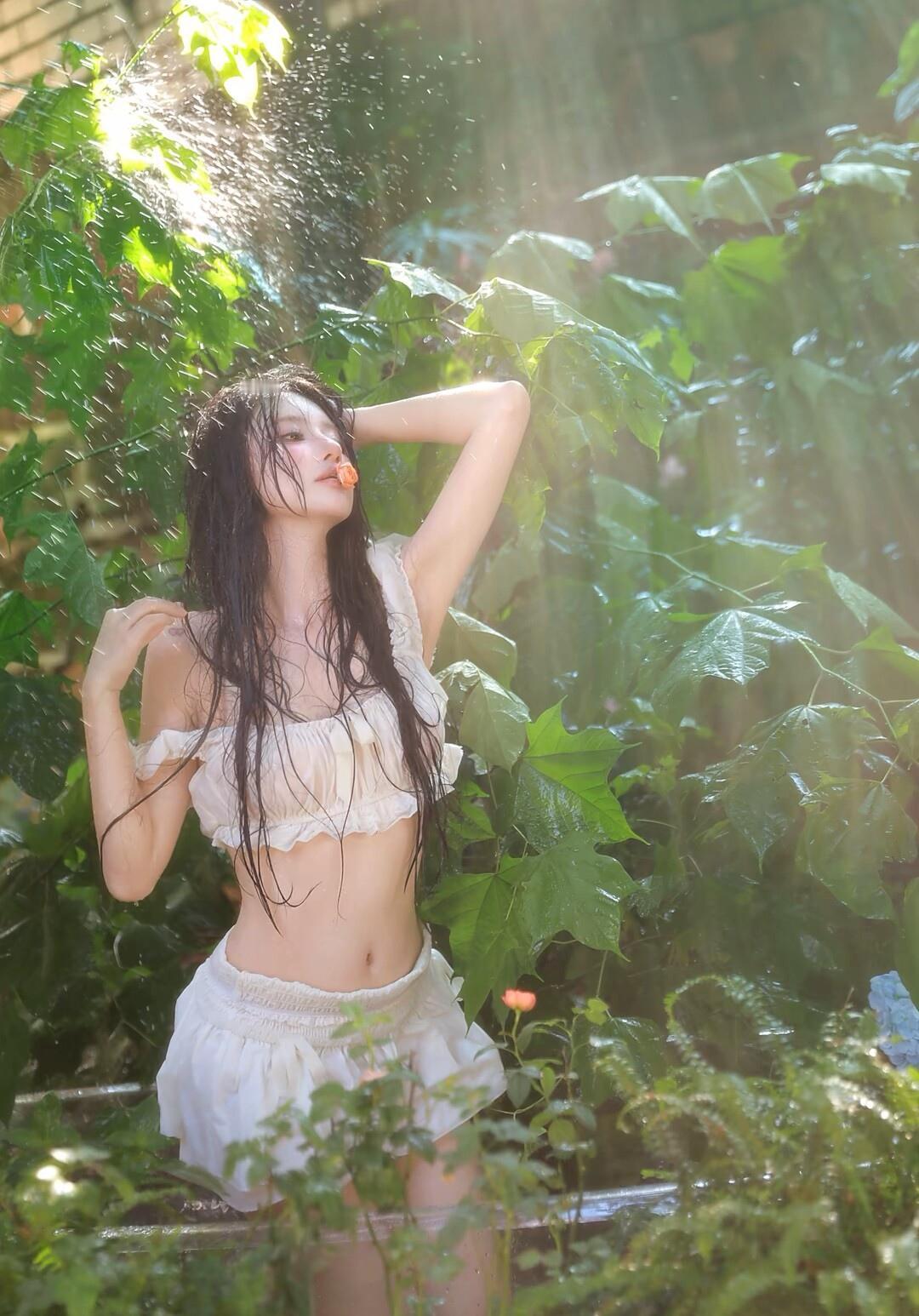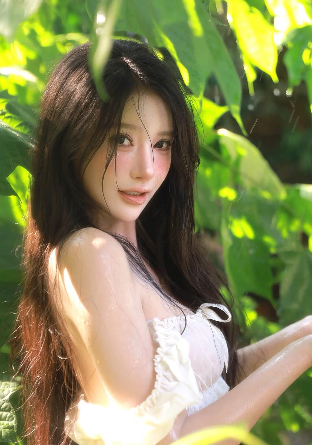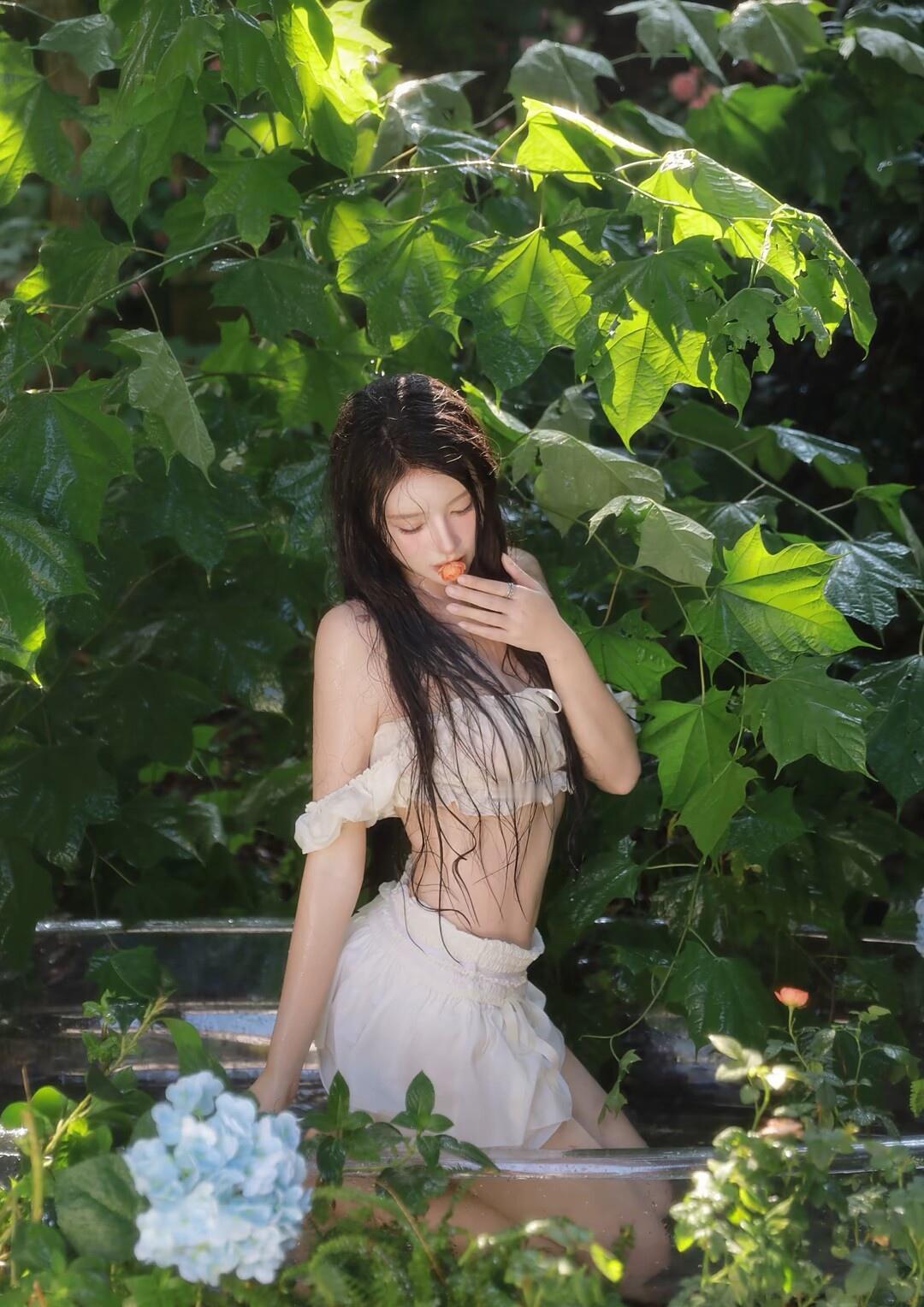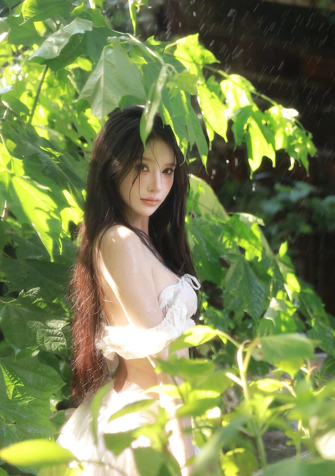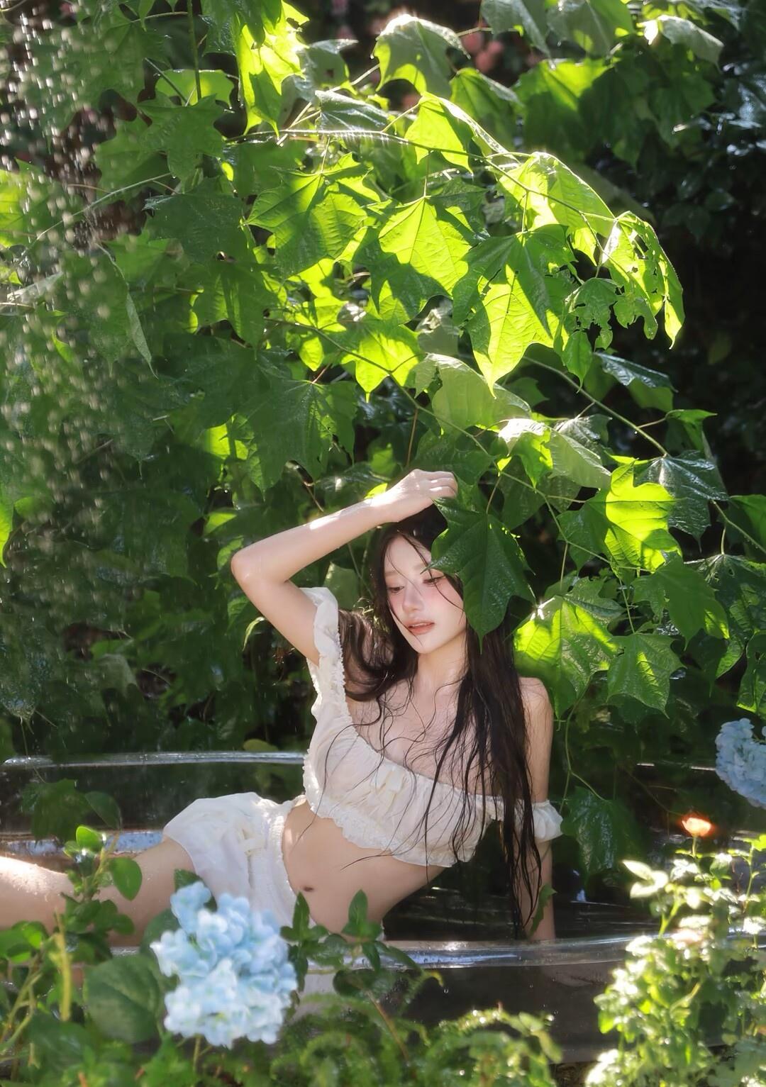夏日清新,绿叶掩映下的少女,宛如童话中的仙子。