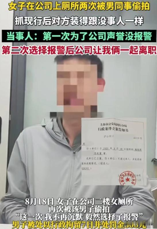 上海,周女士上班时去厕所方便,过了3分钟后,她感觉隔壁不太对劲,便拿手机从隔板下缝隙一瞅,隔壁那男同事居然趴在地上,又是偷看又是拿手机偷拍!周女士直接冲出去把他堵在里头,然后找公司领导,要求解聘这个男同事。 结果,公司说招不着合适的人,一直拖着不处理。没过几天,这男同事又干起这龌龊事。周女士哪能忍,直接就报了警。民警把这男同事带走,拘留了10天。 周女士本以为这事就这么翻篇了,谁能想到,领导居然拐弯抹角地暗示周女士自己离职,这操作,真是让人惊掉下巴! 先来了解一下事情的来龙去脉,事情是这样的,5月初,在某教培机构上班的周女士,上班时去厕所,3分钟后听到隔壁有人进去,却没有一点动静,用手机摄像头从隔板下缝隙查看,竟发现男同事趴地上偷看又偷拍,周女士将其堵住,找领导要求解聘该男同事,公司却以招不到人拖延。 周女士当场怒斥男同事,领导赶来协调,男同事赔了1万私了,这事当时算暂时压下去了。可谁能想到,8月份,这男同事又故态复萌,周女士这次学聪明了,拍下证据后直接报了警。 民警介入后,男同事被拘10天,这下总该老实了吧? 可拘留期满,周女士表示实在无法面对,领导却说要9月后再辞退他。 周女士无奈请假回避,家属去沟通,领导竟称要辞退男同事,周女士就得一起离职。 这领导的操作,简直让人摸不着头脑。 周女士休假回来,领导处处刁难,话里话外暗示她离职。周女士直接答应离职,还申请了劳动仲裁。 公司负责人这时候出来说话了,说第一次事发后招了4个人都不行,所以才又出事。 还说让周女士休假是带薪的,之前说的都是气话。可这话谁信呢? 周女士是被逼无奈,才离职的。 这男同事的行为,严重侵犯了周女士的隐私权,还涉嫌偷拍他人隐私,违反了治安管理处罚法。 公司一开始处理就不积极,后来还暗示周女士离职,这明显是在推卸责任。 周女士申请劳动仲裁,也是为了维护自己的合法权益。 公司要是想让周女士自己辞职,那就得支付经济补偿,这是劳动法规定的。 可公司现在这种态度,明显是不想承担责任。 1,男同事,在厕所趴在地上偷看并偷拍周女士,严重侵犯其隐私权。 《治安管理处罚法》第四十二条规定,偷窥、偷拍、窃听、散布他人隐私的,处五日以下拘留或者五百元以下罚款;情节较重的,处五日以上十日以下拘留,可以并处五百元以下罚款。 隐私权,是自然人享有的私人生活安宁和不愿为他人知晓的私密空间、私密活动、私密信息,依法受到保护,不受他人非法侵扰、知悉、收集、利用和公开的权利。 从男同事的行为看,女厕所隔间,是女性专属的私密空间,男同事进入并实施偷看偷拍,肯定是不合适的。 男同事的行为,符合该条款中偷拍他人隐私的情形,且再次故态复萌,属于情节较重。所以民警将她拘留10天。 2,公司以招不到人,拖延解聘男同事,后来又暗示周女士离职,这种做法不合法。 《劳动合同法》第三十九条规定,劳动者严重违反用人单位规章制度的,用人单位可以解除劳动合同。 男同事偷拍的行为,严重违反道德和公司规章制度,公司本应依法依规及时处理。 公司未积极履行管理职责,还试图通过暗示周女士离职来推卸责任,违反了法律规定。 若公司想让周女士辞职,应按《劳动合同法》第四十六条规定支付经济补偿。公司不积极处理问题、推卸责任的态度,损害了周女士的合法权益。 公司作为用人单位,有义务为员工提供安全、健康的工作环境,保障员工的人身权利不受侵犯。 当周女士提出解聘男同事的合理要求时,公司没有及时采取措施,导致男同事再次实施偷拍行为,给周女士造成了二次伤害。 之后公司领导还拐弯抹角暗示周女士离职,称男同事离职,周女士就得一起离职,这种处理方式是在推卸责任。 如果公司想让周女士自己辞职,按照《劳动合同法》规定,若公司存在迫使员工辞职的违法行为,是需要支付经济补偿的。 公司以各种理由刁难周女士,试图让周女士主动离职,却不承担应有的责任,这是不合法的。 每个人都应尊重他人的隐私和权利,不能做出侵犯他人权益的违法之事,作为用人单位,更要承担起应有的责任,保障员工的合法权益不受侵犯。