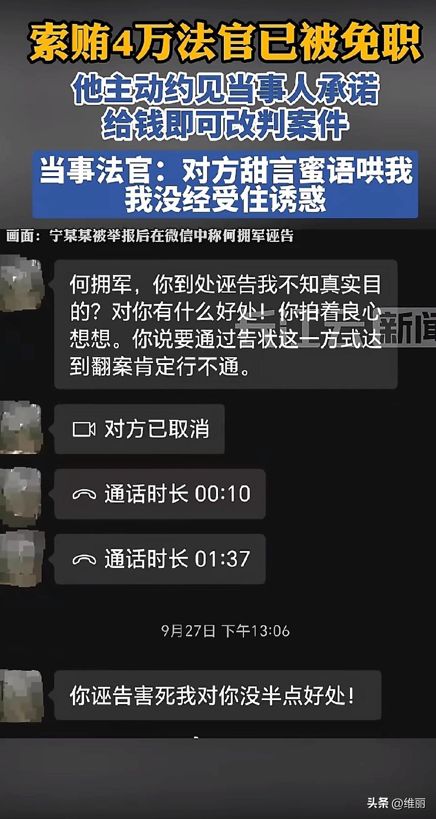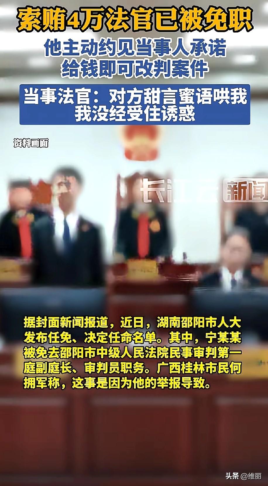 湖南邵阳市中院民一庭原副庭长宁某某被免职了。2023年,广西的何拥军上诉民事案,宁某某作为主审法官约见他,要4万块承诺改判,结果案子没改判,何拥军就实名举报了 。 宁某某说自己是被设套,对方说钱放他这打点关系,自己没经住诱惑,还曾微信指责何拥军诬告。现在邵阳市人大根据纪检初步结论免了他的职,他说愿意受罚 。 法官手握审判权,本该守好公平底线。不管是主动索贿还是“被设套”,收钱就已经踩了红线。这种行为不光毁了自己,更伤了大家对司法公正的信任。免职只是初步处理,希望能彻查到底,给当事人和公众一个交代,也给其他法官敲个警钟。