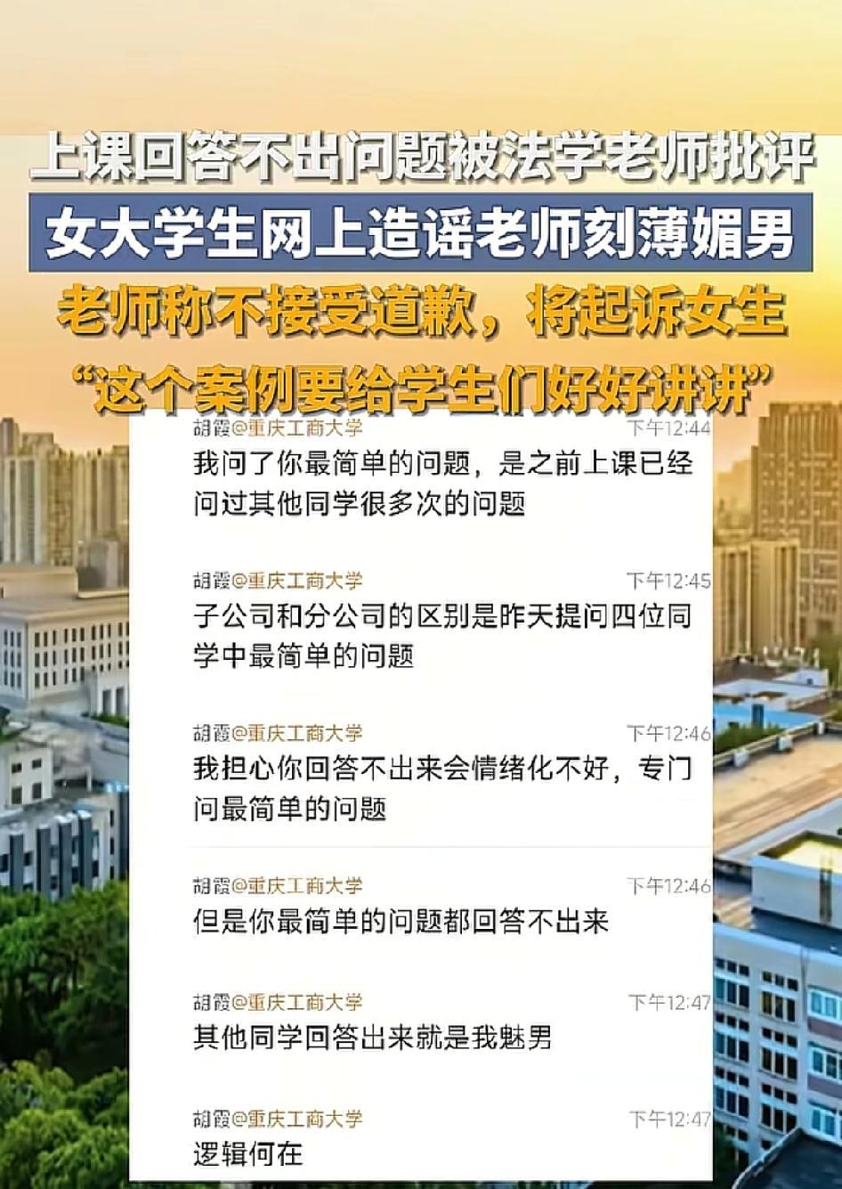 女大学生网上造谣老师“刻薄媚男”! 一女大学生上课答不出题被老师批评,转头就在网上造谣老师“刻薄媚男”,结果老师直接硬气回怼,不接受道歉,必须起诉! 老师问的是“子公司和分公司的区别”,这在商法里属于基础到不能再基础的知识点,之前还问过其他同学好多次。老师怕她情绪化,特意挑了最简单的问,结果她答不上来,就给老师扣了个“媚男”的帽子。这逻辑就跟别人会做题就是老师偏心一样,纯属无理取闹! 老师不接受道歉,就要拿这个案例给学生好好讲讲,这其实是个特别好的普法机会,让学生们看看,法律是怎么保护公民名誉权的,造谣者会付出什么代价,这比空讲法条有用多了! 人大硕博的法学天尊,专门研究这方面的专攻老师, 私下吐槽一下就算了,还发网上,girl 你简直是天下第一猛。