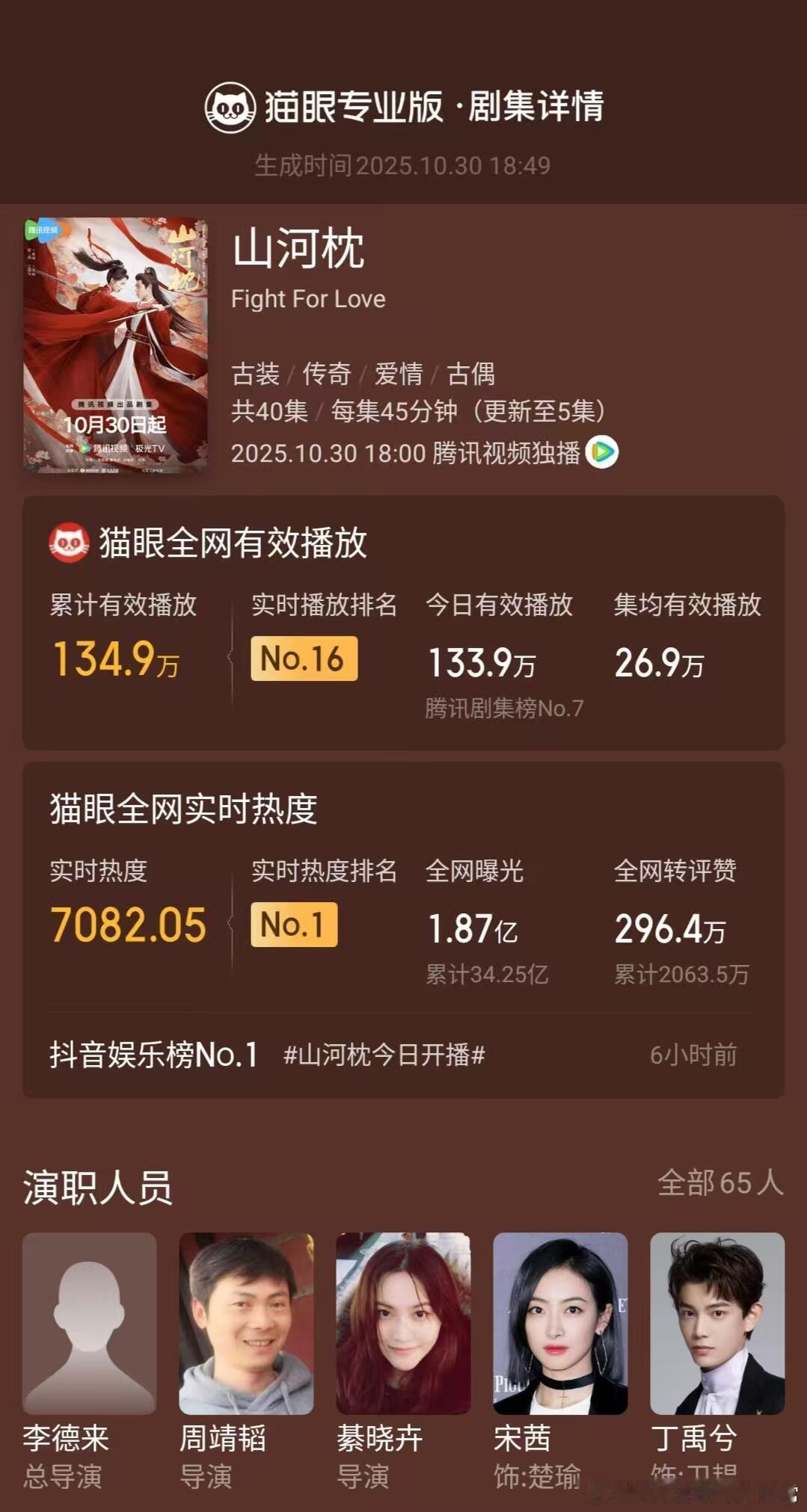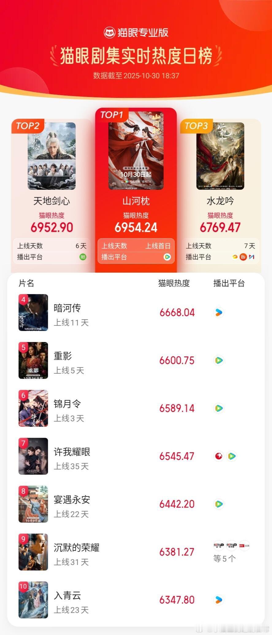山河枕热度据猫眼专业版数据,宋茜、丁禹兮领衔主演网络剧《山河枕》开播37分钟,实时热度登顶猫眼剧集热度榜!出乎意料的好看!第二集给我看哭了[苦涩][苦涩]