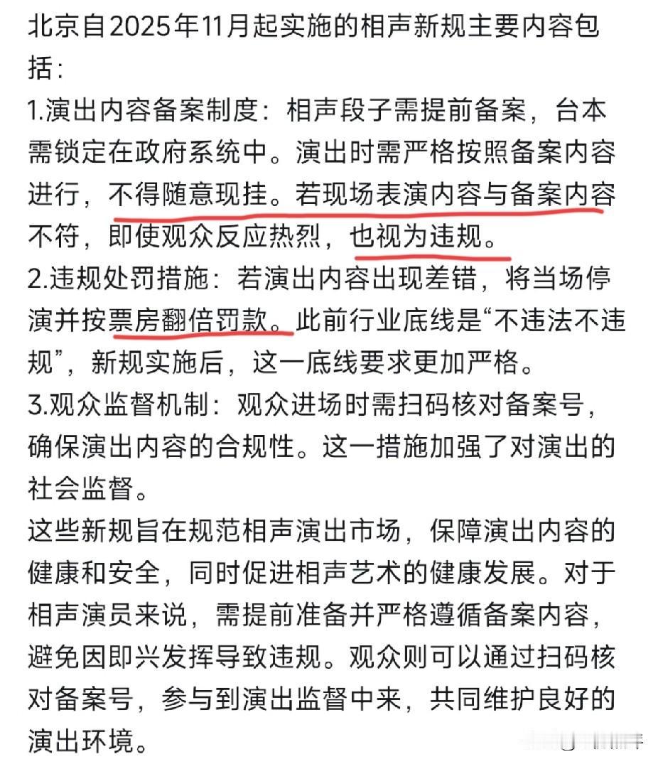 完了!以后到现场听相声搭茬的快乐没有了! 因为就是你想跟台上的演员搭茬互动,演员怕停演怕罚款,也不敢回应你了,更别说随便点节目让演员唱了! 根据网上爆出的北京最新出台的演出规定:演员在台上的现挂,就算现场节目效果好,也要被主管部门处罚!因为现挂不在演出报备内容里。 按照新出台的规定,若演出内容和报备的内容出现差错,会被当场停演并按票房翻倍罚款! 新规定在网上爆出后,很多网友都在说,这规定大概率是针对德云社的 ,因为德云社的现挂比较多,也是很多观众喜欢去现场听德云社相声的一个原因。 也有网友说这个规定的出台,让那些观众一搭茬就忘词的相声混子高兴了! 也有网友调侃谁愿意天天去听一字不差的对口晚报?好不容易跟喜欢的演员搭个茬高兴一下,还不让了,这样的相声还能吸引观众去听剧场相声吗? 也有网友说:我看相声是来娱乐自己放松自己的,我还要清楚备案内容监督演出?我疯了吗?! 目前还不知道这个网上爆出的新规定是不是真的,但从大部分网友的反应来看,很多网友认为这个规定有点苛刻了!