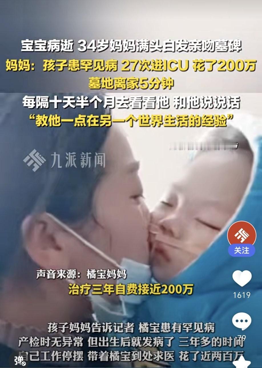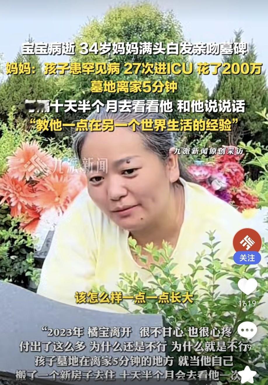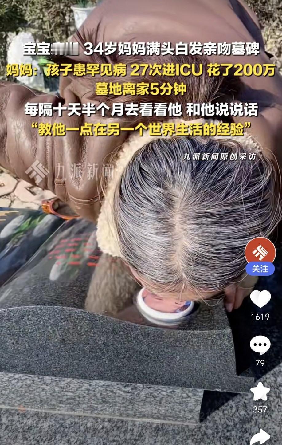 河南南阳34岁妈妈满头白发。3岁宝宝因罕见病去世,生前27次进ICU。产检时无异常,可出生后就发病,妈妈花了近两百万带孩子到处求医。2022年孩子数次经历生死考验,妈妈头发一下子全白,人也瘦了很多。 A网友:这姑娘的经历看后泪水止不住的往下流,30来岁,头发白成这样,太命苦了。原来悲伤和痛苦真的会让人青年白头。希望孩子在天堂没有痛苦。 B网友:之前没有孩子的时候还体会不到,现在有了自己的孩子,明白了很多事,以前和父母争吵的我,现在尽量去平和耐心的讨论各种事情,不吵不闹不嫌烦,90后的我们,陪伴父母的时间也不过短短20-30年了。 C网友:罕见病,无解啊!不是钱、时间、精力能解决的,还是要自己想开点!再生一个宝宝吧,慢慢治愈自己,能怎么办呢?世间太多的生离死别。 当了母亲之后能够理解这位母亲的遗憾和心痛,养孩子最怕孩子生病,孩子遭一点罪,父母都心疼不已。希望这位妈妈能尽快走出来,振作起来,带着爱和遗憾好好往前走。你还年轻,还需要生活,你这样只会让家庭氛围更糟糕,孩子命本来就已经很苦了,你还这样折腾自己,放下执念,让孩子好好地走吧!