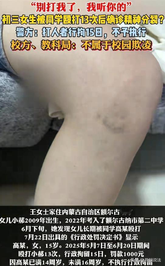 “这事太气人了!”内蒙古,初三女生小郝一个月内竟被同学高某打了13次,家长怀疑是校园霸凌,学校却说两人是好朋友,不构成欺凌。最终,对打人者作出15日拘留处罚,但因年龄问题不执行。这到底算不算校园霸凌? 2022年,王女士的女儿小郝考进内蒙古某中学,原本是件开心事,可到了2025年临近中考时,小郝却像变了个人。 她不吃不喝,晚上也睡不着,死活不愿上学。6月19号那天,小郝突然找小姨要600块钱,理由特别牵强,而且当月不到20天,她就找小姨要了十多次钱。 小姨觉得不对劲,6月20号就到学校去问,这才知道小郝长期被高某殴打,要的钱也是给高某的。 当天晚上,王女士赶紧联系班主任,第二天就和家人跑到学校,想查看监控,可学校就是不让看。没办法,她们只能报了警。 民警调取了6月20号的监控,发现高某因为考试没考好,直接扇了小郝好几个耳光。王女士她们想查看其他时段的监控,学校却拒绝了。 6月23号,王女士她们再次要求调取完整监控,还是被学校拒绝,只好再次报了案。过了几天,警方通知她们,从5月7号到6月20号,高某一共打了小郝13次。 最终,认定了高某殴打的事实,对他顶格行政拘留15日,还罚款1000元。可因为高某才15岁,拘留没有被执行。 学校一直说,小郝和高某是好朋友,平时打闹很正常,不构成欺凌。 王女士一家却觉得,这分明就是校园霸凌。 现在,小郝在接受 治 疗,王女士一家则四处奔走,想给女儿讨个公道。 可学校的态度,让她们特别无奈。 那么,高某的行为算不算校园霸凌?学校有没有责任?监护人该不该赔? 1,高某的行为 从5月7号到6月20号,13次殴打小郝,还因为考试没考好就扇耳光,索要钱财,这完全符合校园霸凌的特征。 根据《未成年人保护法》第39条,校园欺凌指学生间蓄意或恶意通过肢体、语言等方式造成伤害的行为。 高某多次殴打并索要钱财,不是普通打闹,而是持续性的暴力侵害。 更严重的是,小郝因此被确诊 精 神 分 裂,说明暴力已造成严重损伤。对其拘留15天,虽因年龄不执行,已说明高某的行为,有违法性。 2,学校的责任 《未成年人保护法》第39条明确规定,学校发现学生欺凌应及时制止、调查处理,并通知双方家长。 但王女士多次要求调监控,学校却拒绝提供,导致关键证据获取延迟。 学校明知两人打闹,却未干预,放任暴力升级,违反了教育、管理职责。 如果学校及时调取监控、制止殴打,小郝的伤害可能不会这么严重,所以学校在监管上存在明显过失。 3,高某监护人的责任 高某15岁,属于限制民事行为能力人,其侵权行为造成的损失,应由监护人承担民事赔偿。 王女士可以起诉高某家长,要求赔偿医疗、护理等费用,这是监护人履行赔偿义务的直接依据。 《民法典》规定,无民事行为能力人、限制民事行为能力人造成他人损害的,由监护人承担侵权责任。 至于敲诈勒索,高某索要钱财若带有威胁性质,可能涉嫌该罪名。 但本案中,更突出的还是校园霸凌和人身伤害,以治安管理处罚为,主拘留+罚款,民事赔偿,才是小郝家庭维权的重点。 目前,对高某作出15日拘留、1000元罚款的行政处罚,因未满16周岁不执行,学校监管责任及民事赔偿,还需通过诉讼进一步认定。 校园本应是成长的净土,绝不容暴力滋生,每个孩子都值得被温柔以待,学校要切实履行监管责任,守护好学生的安全。