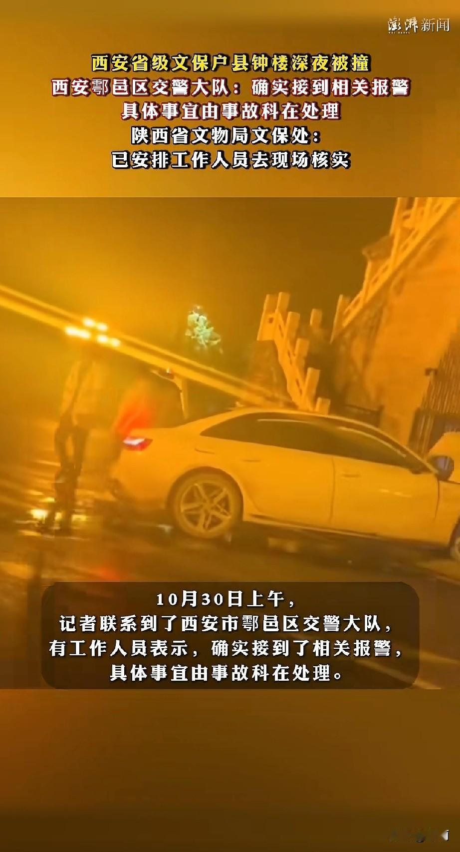 10月30日凌晨2点50分,西安鄠邑区一辆白色小车沿东大街撞向省级文保户县钟楼北侧楼梯,车头严重变形,楼梯墙体有裂痕,石栏杆也移位了 。这钟楼是明朝崇祯八年建的,仿西安钟楼样式,算省级重点文保单位呢 。 现在肇事车被交警扣了,事故原因还在查。文物部门拉了警戒线,封了北侧楼梯,不过南侧还能走,不影响参观 。专家已经去评估受损情况,后续要按“不改变原状”原则修,估计得三到六个月 。 这事儿真让人揪心,几百年的老东西撞一下就难复原了。按文物保护法,要是撞得严重,司机可能要赔钱,甚至负刑责 。希望能赶紧查清原因,也该在文保单位周边加些防护,别再出这种事了。
