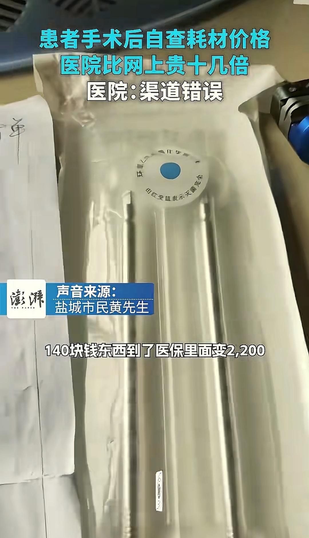 这下瞒不住了, 盐城市第一人民医院是彻底出名了, 不仅江苏,全国都知道了,天价耗材居然这么“离谱”! 黄先生骨折, 医院用的一根针走医保还要483元, 结果网上同厂同款才42元, 差了十多倍! 曝光后医院立马降价, 可网友们的吐槽没停, 有人说给丈母娘买的升血小板药, 医院卖1500元, 网上官价才910元。 最让人纠结的是, 医院的药能医保报销, 但架不住原价贵; 网上便宜却不能报, 算下来真没差多少。 这根本不是报不报销的问题, 是耗材和药品的定价透明度太让人没底了。 你有没有遇到过医院和网上药品耗材差价大的情况? 该怎么避免花这种冤枉钱呢