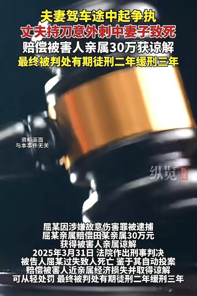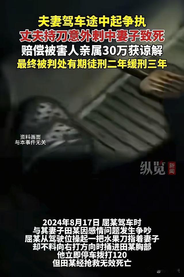 湖北鄂州,男子开车时和妻子发生争执,于是抄起一把水果刀指着妻子,谁知车子右转时水果刀不慎捅进妻子胸口,男子立即停车并打了120,可妻子还是抢救无效死亡了。 据封面新闻、纵览新闻等报道,屈某是河南许昌人,职业是货车司机,平时拉活的时候妻子田某经常和他一起出车。 去年8月17日,屈某开着一辆厢式货车出去送货,妻子田某坐在副驾驶上。 上午10点多钟,车子行驶到湖北省鄂州市华容区路段时,屈某和田某因为情感问题吵了起来。 屈某脾气急,一时生气之下,他左手抓着方向盘,右手从驾驶座抓了一把水果刀对准妻子田某。 夫妻二人吵得很凶,结果,前方路段出现转弯,屈某在向右打转向的时候,水果刀一不小心扎进了妻子田某的左胸口。 屈某拿刀只是吓唬吓唬田某,并不是真的要拿她怎么样,看到田某浑身是血,屈某吓得赶紧停车并打了120。 可是事不凑巧,水果刀正好刺中了田某左肺动脉,田某最终因血气胸合并急性失血性休克死亡。 案发当天,屈某因涉嫌故意伤害罪被刑拘,8月30日被正式逮捕,检方以过失致人死 亡罪对屈某提起了公诉。 那么,屈某到底是构成故意伤害罪,还是构成过失致人死 亡罪?二者有什么区别? 一、什么是故意伤害罪? 《刑法》第二百三十四条规定,故意伤害他人身体的,构成故意伤害罪。 故意伤害罪是指故意非法损害他人身体健康的行为。 故意伤害罪要求行为人明知自己的行为会发生损害他人身体健康的结果,并且希望或者放任这种结果的发生,并且实施了非法损害他人身体的行为,这种行为可以是积极的作为,也可以是消极的不作为。 例如,犯罪嫌疑人因琐事与他人发生冲突,故意使用凶器对他人身体进行伤害,造成他人身体损伤,这就是典型的故意伤害行为。 故意伤害行为中,犯罪嫌疑人具有伤害他人身体的故意心态,对伤害结果持希望或者放任态度。 二、什么是过失致人死亡罪? 《刑法》第二百三十三条规定,过失致人死亡的,构成过失致人死亡罪。 过失致人死亡罪是指行为人因疏忽大意没有预见自己的行为可能导致他人死亡,或者已经预见而轻信能够避免这种结果的发生,以致发生他人死亡的结果。 过失致人死亡的过失,包括疏忽大意的过失和过于自信的过失。 疏忽大意的过失是指行为人应当预见自己的行为可能发生他人死亡的结果,因为疏忽大意而没有预见。 过于自信的过失是指行为人已经预见自己的行为可能发生他人死亡的结果,但轻信能够避免,却最终未能避免这种结果的发生。 三、屈某的行为到底是构成故意伤害罪还是过失致人死亡罪? 屈某在与妻子争吵过程中,一时生气拿起水果刀对准妻子。 从屈某的行为来看,他拿刀只是吓唬妻子,并非真的要伤害她,这表明他在主观上并没有直接追求伤害妻子身体的故意心态,不符合故意伤害罪中积极追求或放任伤害结果发生的主观构成要件。 在车辆转弯时,屈某手中的水果刀不慎扎进妻子左胸口,这一结果是屈某始料未及的。 屈某没有预见到在车辆行驶操作过程中,水果刀会意外刺中妻子并造成严重后果,属于因疏忽大意没有预见自己行为的危险性,最终导致了妻子死 亡的悲剧。 综合来看,屈某的行为更符合过失致人死 亡罪的构成要件。 经审理认为,案发后,屈某主动投案自首,并积极赔偿田某家属30万,获得了他们的谅解,可从轻处罚。 最终,屈某因过失致人死 亡罪被判处有期徒刑2年,缓刑3年。