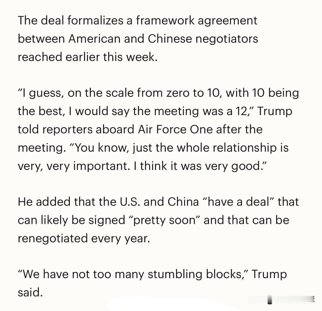 川普对协议的评价。 “如果按0到10分来打分,10分是最好,我会说这次会谈是12分。你知道,整个关系非常、非常重要。我认为会谈非常好。” “美国和大国“已经达成协议”,可能“很快”就会签署,并且该协议可以每年重新谈判。” “我们之间的障碍不多。”