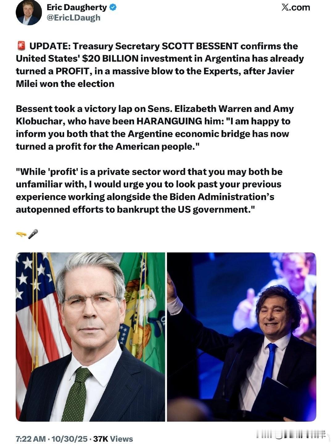 更新:美国财政部长Scott Bessent确认,美国在阿根廷的200亿美元投资已经实现盈利,这对专家们来说是一次重大打击,此前Javier Milei赢得大选。 Bessent对参议员Elizabeth Warren和Amy Klobuchar进行了“胜利嘲讽”,这两位参议员此前一直在对他进行严厉指责: “我很高兴地告诉你们,阿根廷这座经济桥梁如今已为美国人民带来了利润。” “虽然‘利润’这个词对你们来说可能比较陌生,因为它属于私营部门的语言,但我建议你们不要只局限于过去与拜登政府一起,用自动签名工具努力让美国政府破产的经验。”