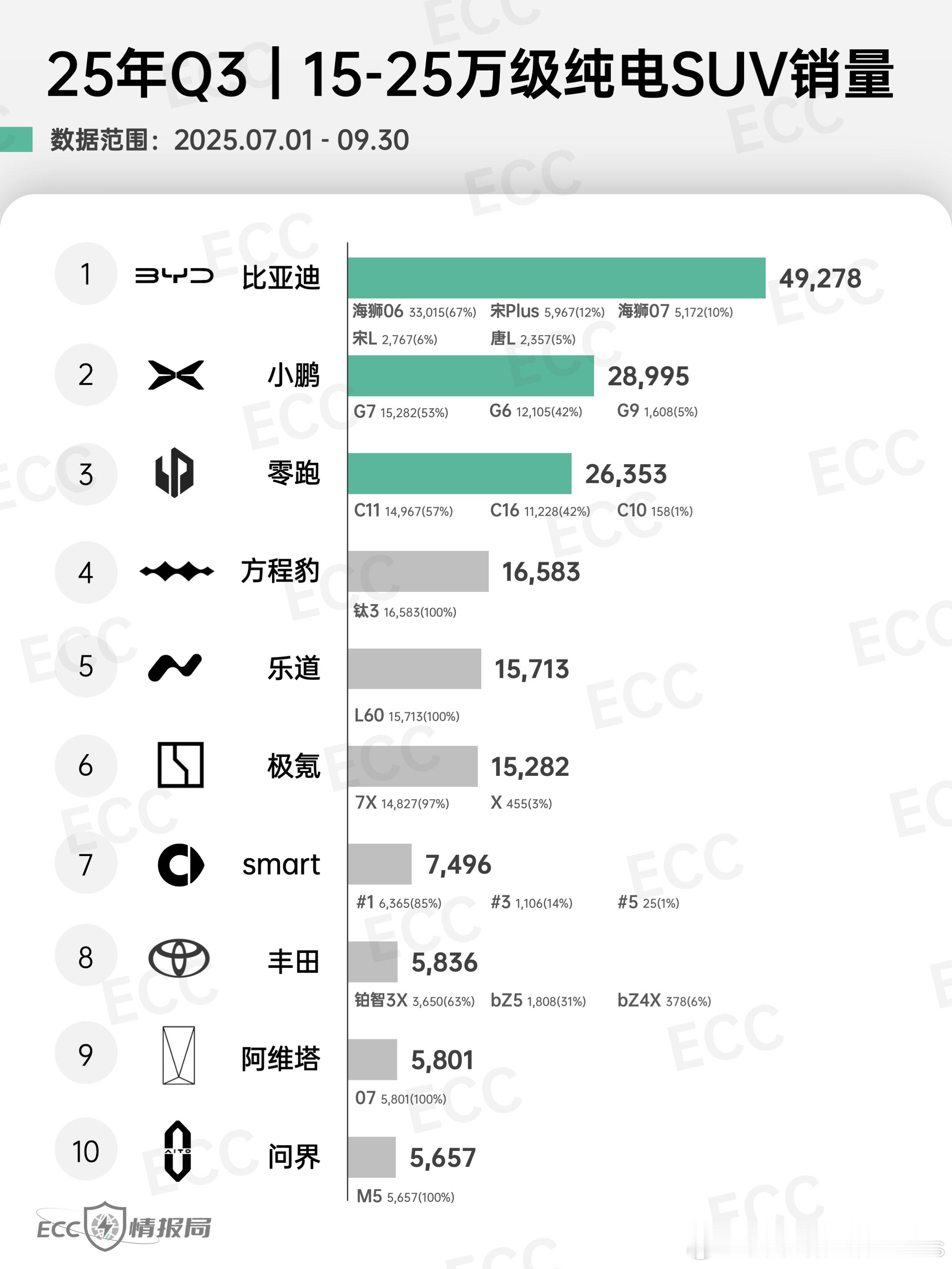 最近看到乘联会数据,发现小鹏在15-25万纯电SUV这个细分市场已经悄悄爬到了第二的位置。这个销量表现,感觉都没必要加新势力的定语了,毕竟“每卖出8台纯电SUV就有1台是小鹏 ”这绝对是主流车企的水准。