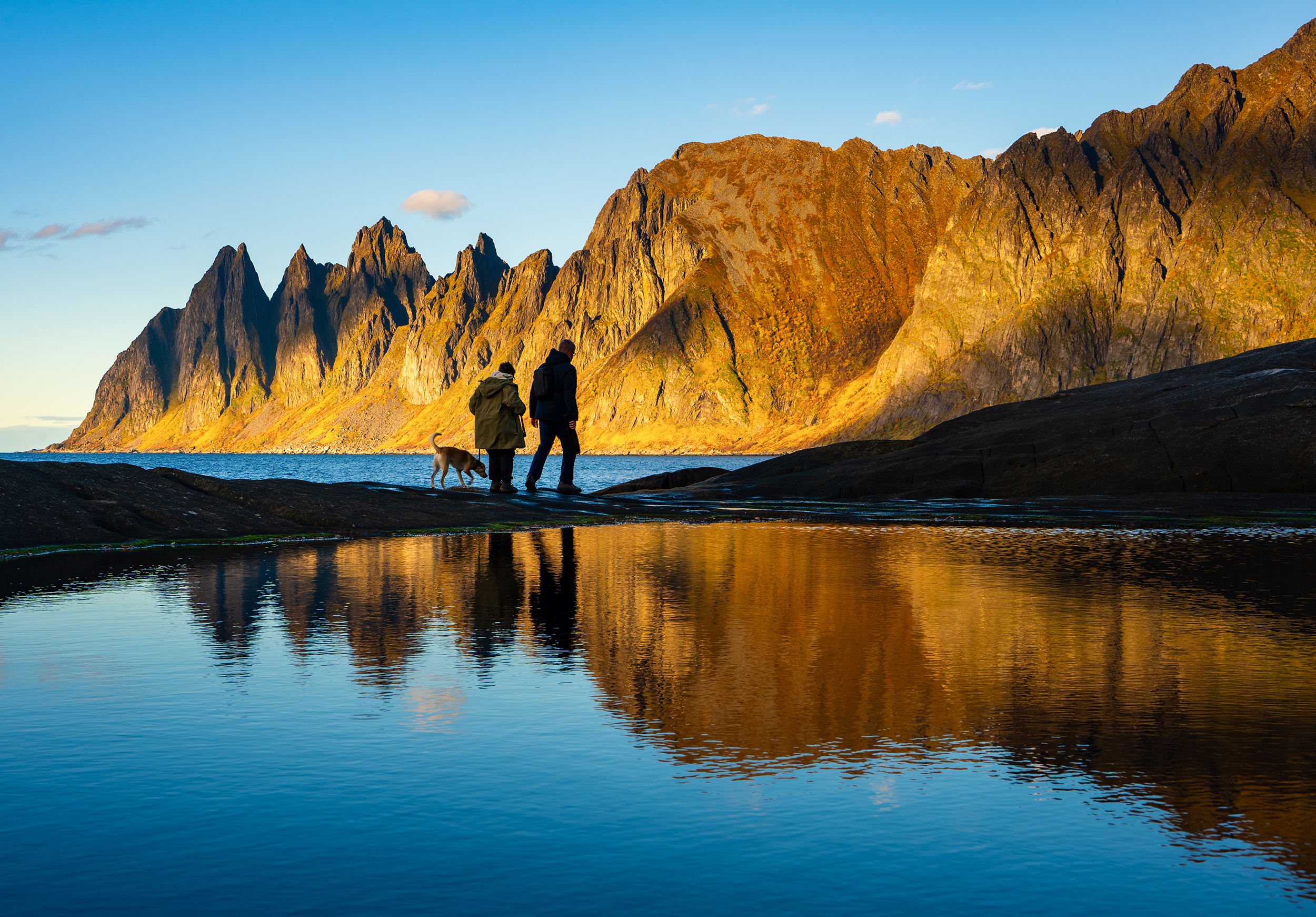 挪威塞尼亚的狼牙山。黄昏中,一对老人和爱犬踏石而行。半世纪默契溶于风里,无需言语