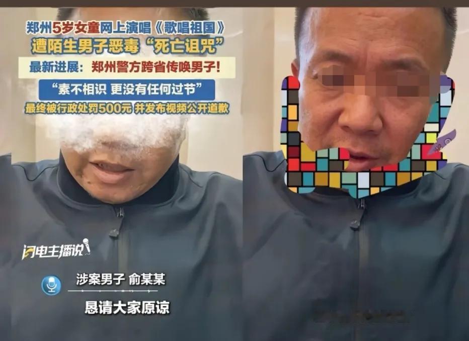 一个五十多岁的老男人,竟然诅咒一个年仅5岁的小女孩,真是白活了! 郑州5岁小女孩在网上演唱《歌唱祖国》,结果被这个老男人诅咒。虽然此人最终被警方处500元罚款,并在网上录视频公开道歉。但我还是要说几句。 一个年幼的孩子在网上唱一首歌,你认为她唱得不好,唱得没有水平,作为成年人你不听就行了,为什么要用恶毒的语言去诅咒她?她与你有什么仇什么恨?如果不是一个心理变态扭曲的人,断然不会做出这样的事情来。 再说,这孩子演唱《歌唱祖国》这首歌,是犯了你的什么禁忌吗?这首歌被很多人视为“第二国歌”,在中国家喻户晓已经唱了几十年,从来没有人对此提出过任何质疑。可你偏偏针对一个唱这首歌的孩子,用如此恶毒的语言去诅咒她,你是吃饱了撑的?还是欠抽? 个人感觉,对他的处罚还是太轻了,最起码行政拘留七天起步,罚款一千起底!